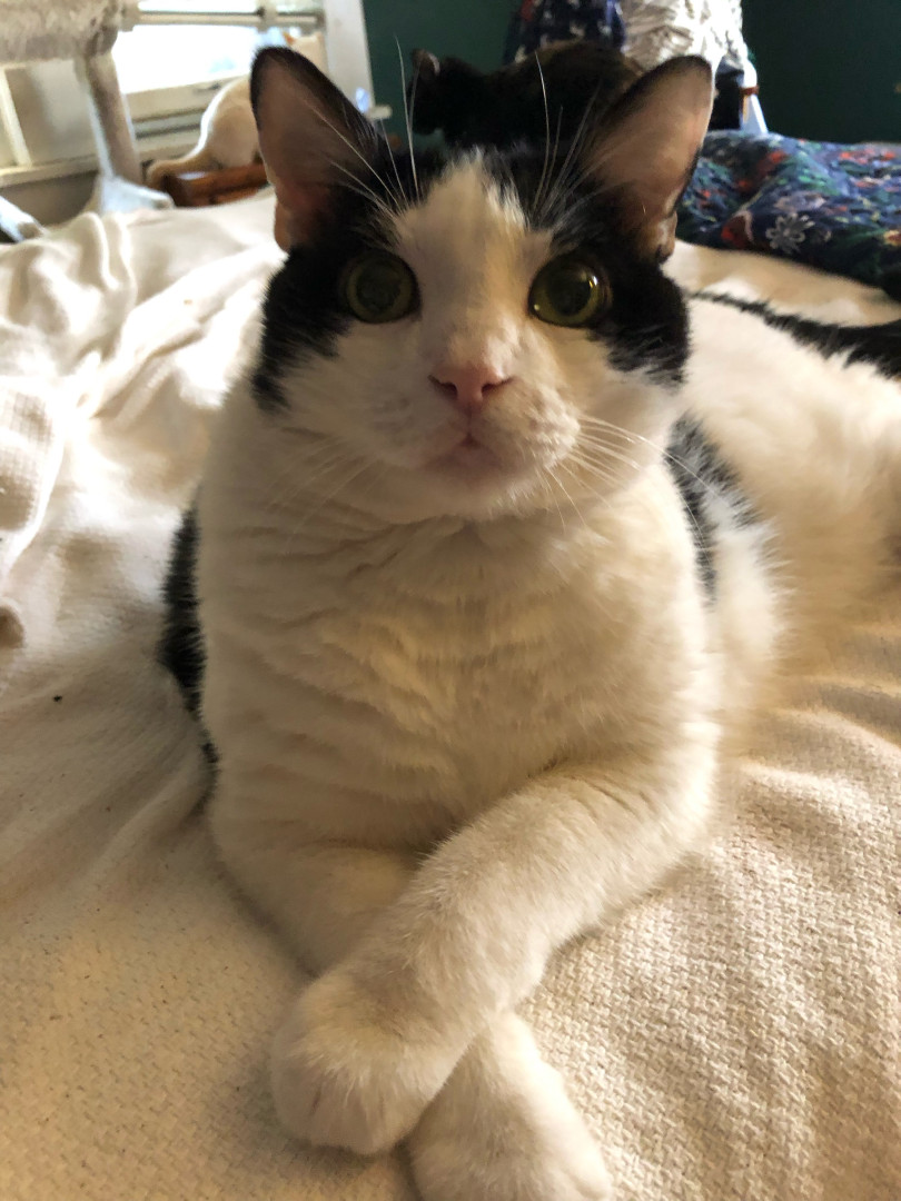 Charlie Jack is 20 years old. I rescued him from the parking lot where I worked. He is still alert, loves treats and snozzes a lot 😻