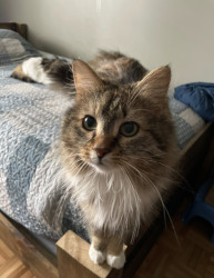 Charms is a sweet girl. She loves to cuddle and rubs her face on us. She purrs constantly. Very happy girl!