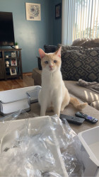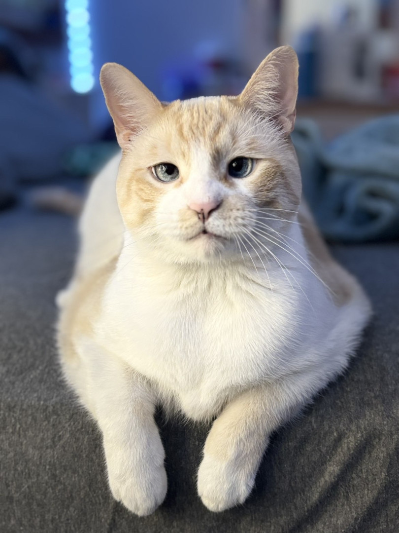 He is very friendly with everyone, and will meow when he wants you to throw him a piece of food, his eyes get very dilated and it’s super cute