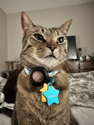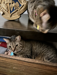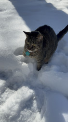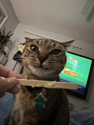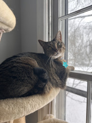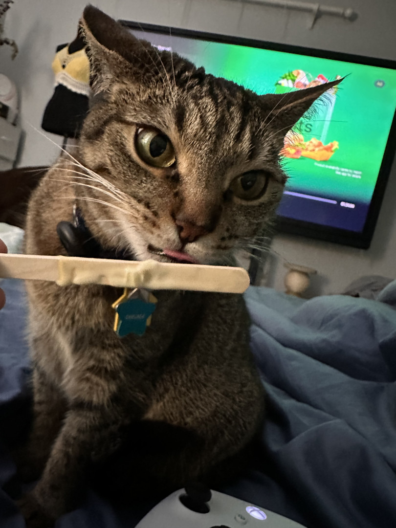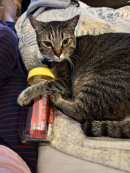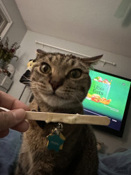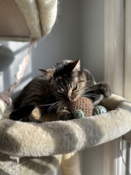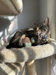 Our rescued 4-year old, sassy chubby tabby girl is obsessed with squeeze up treats. She also loves watching birds and squirrels outside!