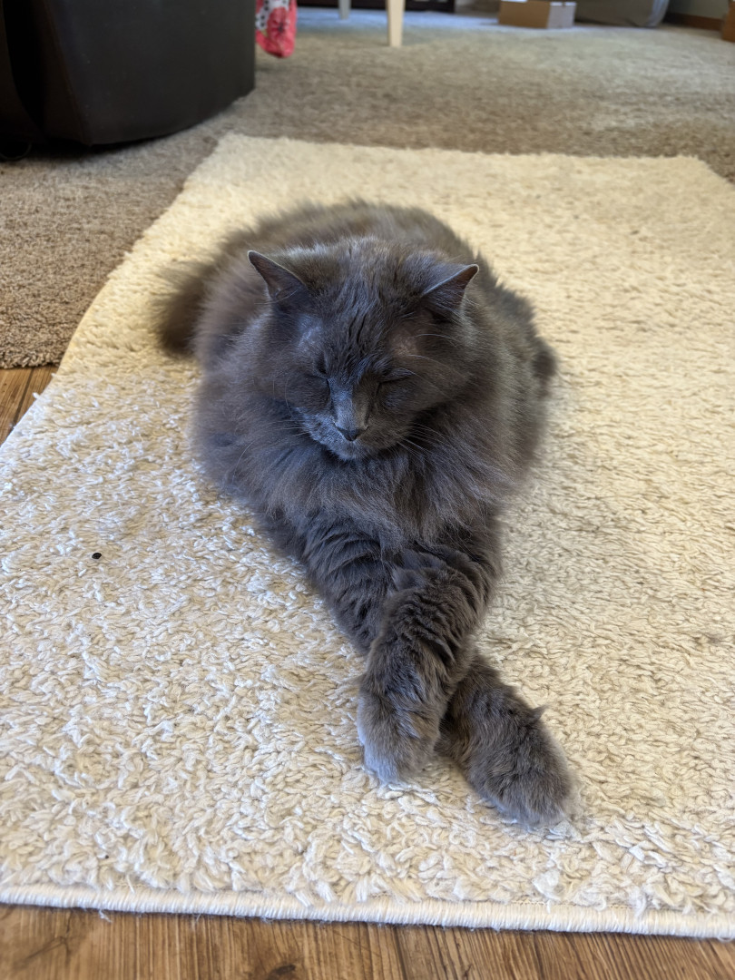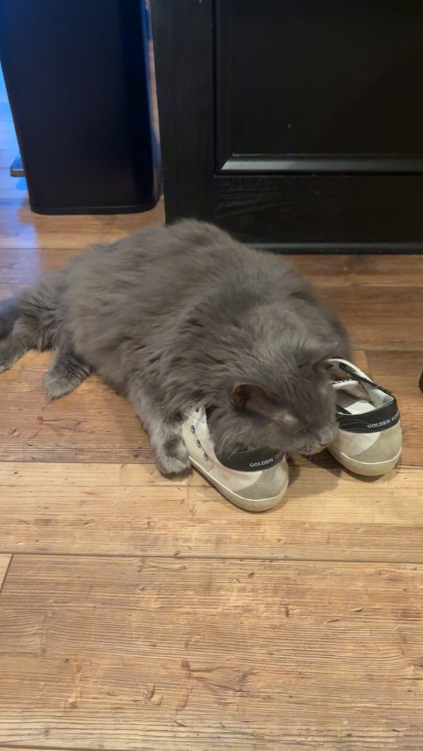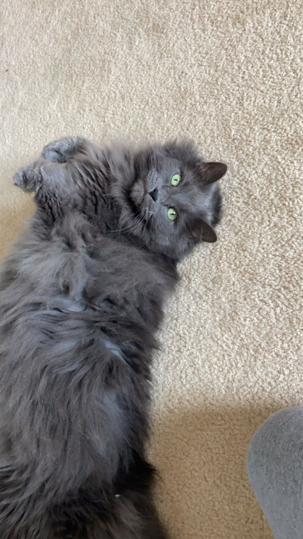 Chico’s most unique quality is the dramatic, no-warning way he decides it’s time to lie down. He doesn’t gently settle onto the floor like a normal cat, he just falls over, as if gravity suddenly won an argument. One second he’s standing, and the next he is a fluff-ball on the ground. It’s impossible not to laugh when he does it, especially because Chico seems so proud of his signature move, as if collapsing dramatically is both an art form and a personal talent.