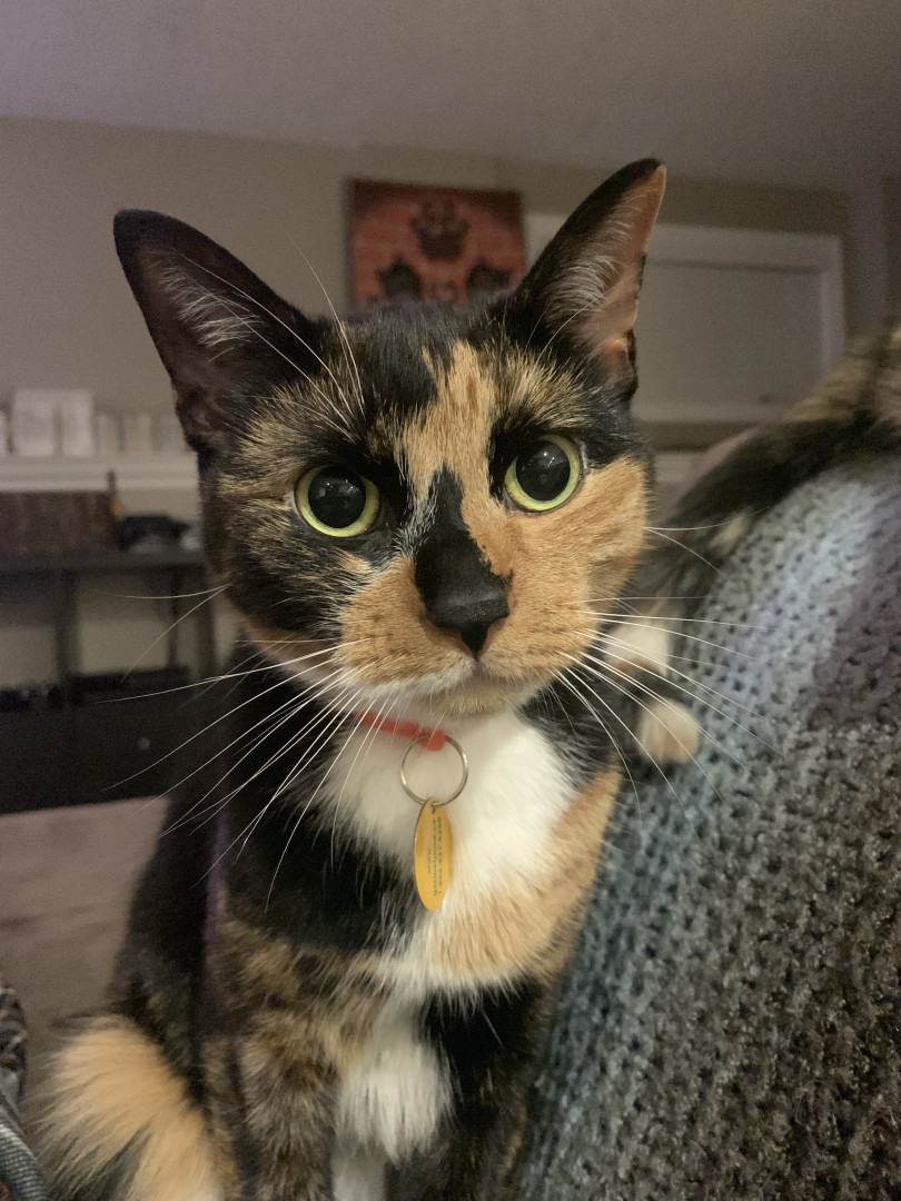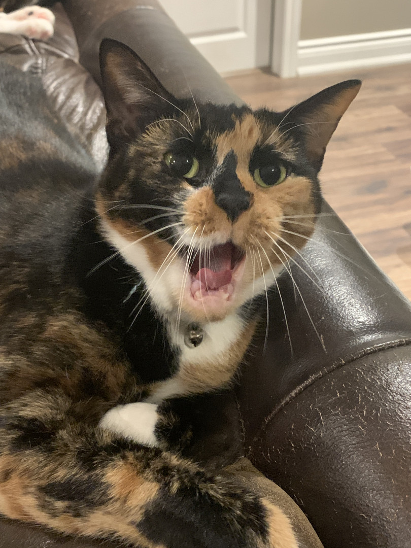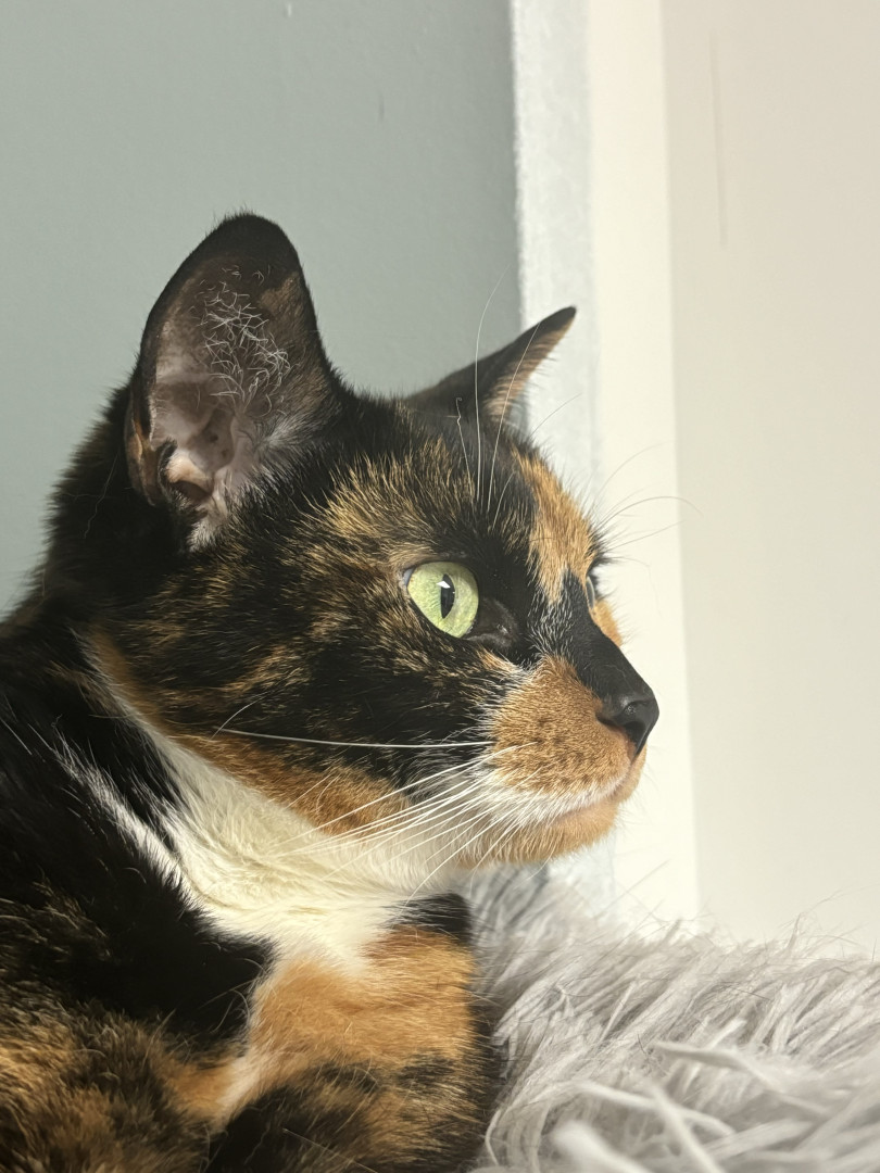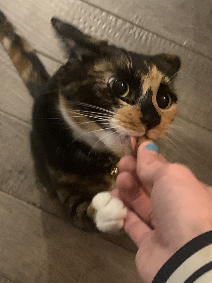 Chie is a very lovable and food motivated calico. She likes to cuddle up with me at night and act as my alarm in the morning by meowing (: