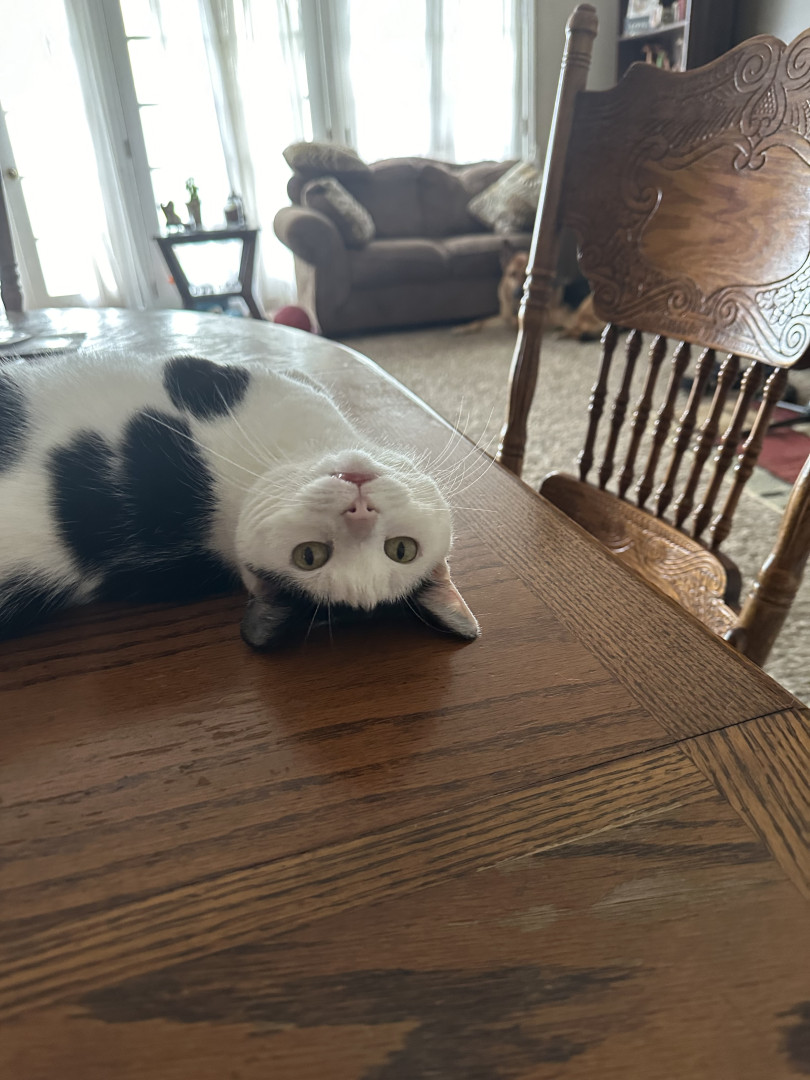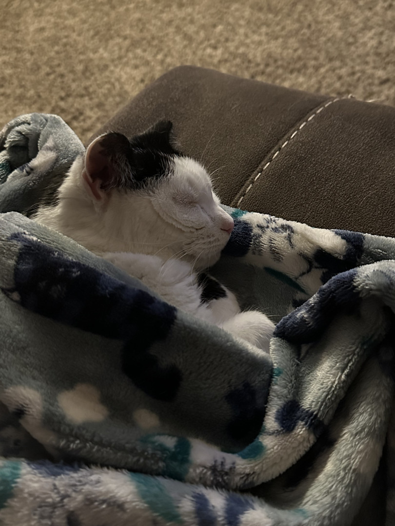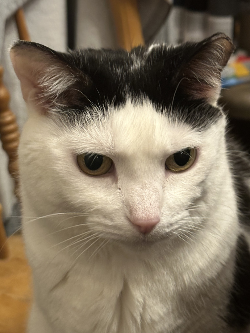 Claire’s most unique quality is her ear tip and her meow. She was originally a TNR community cat before I took her into my home. She was ran over by a car by accident and it has caused damage to her vocal cords so she is not able to meow like a normal cat. She has a whisper meow with a small quiet squeak.