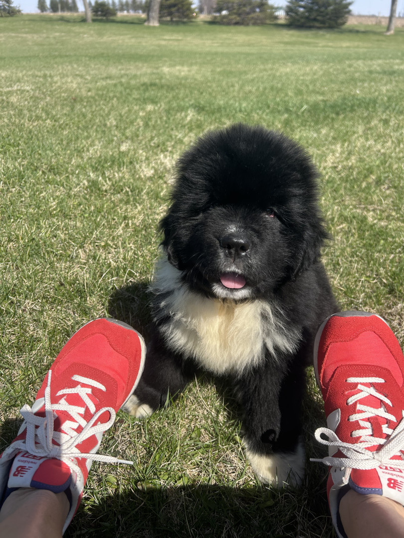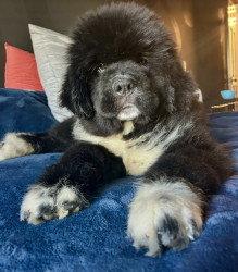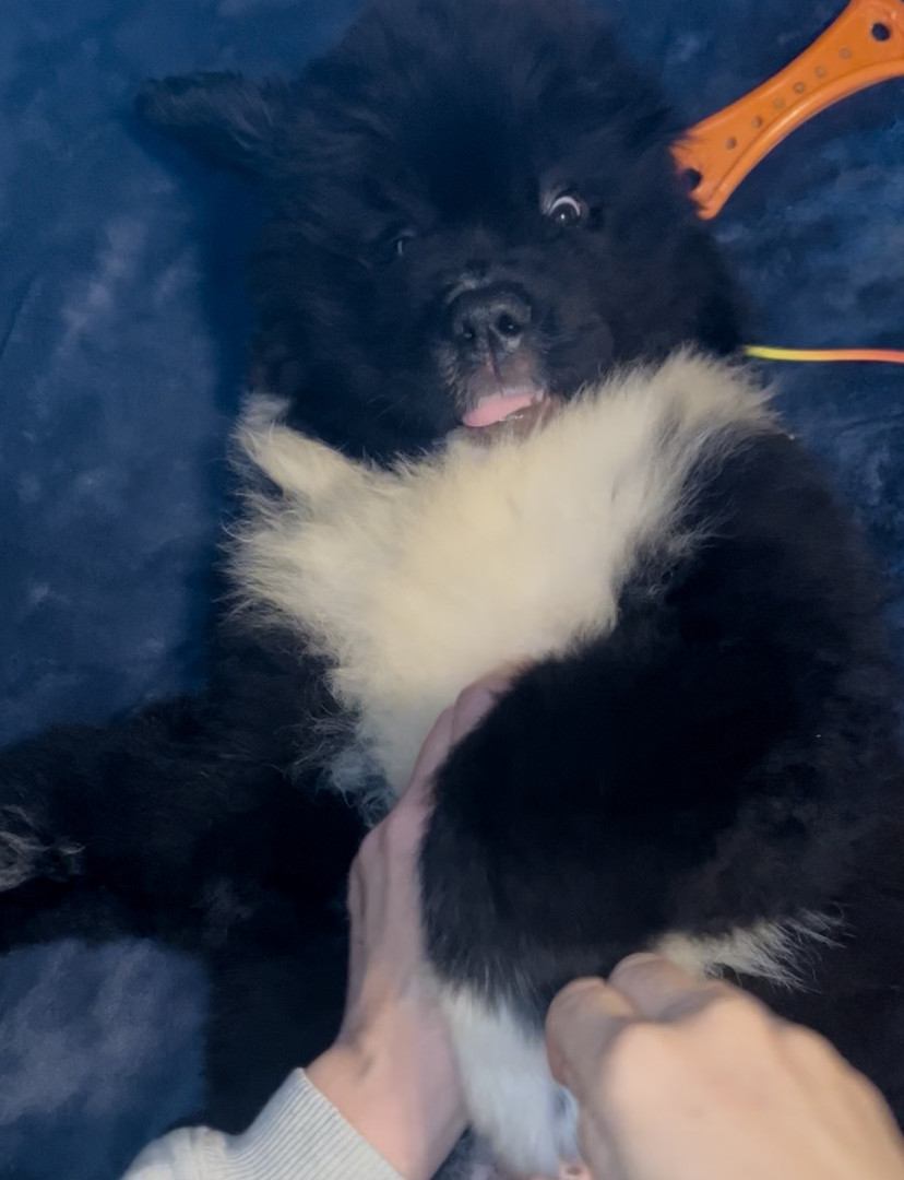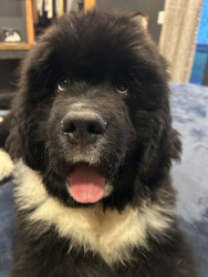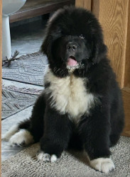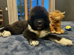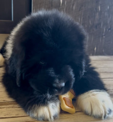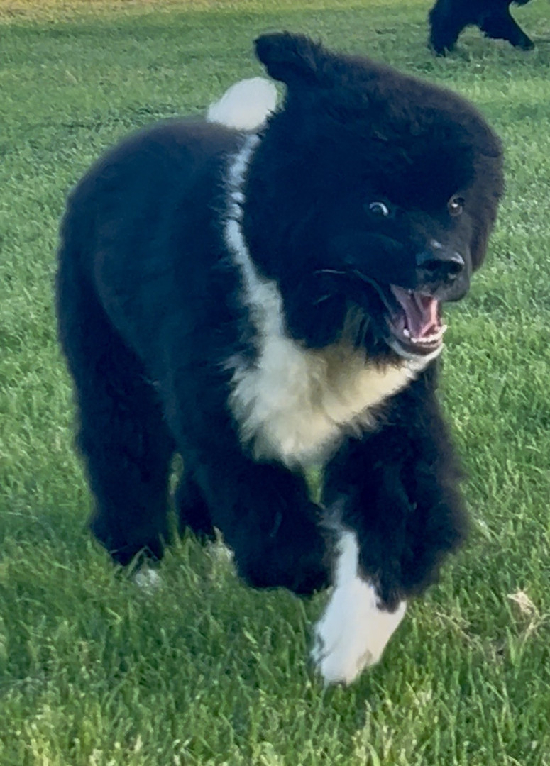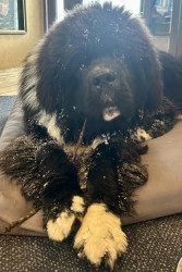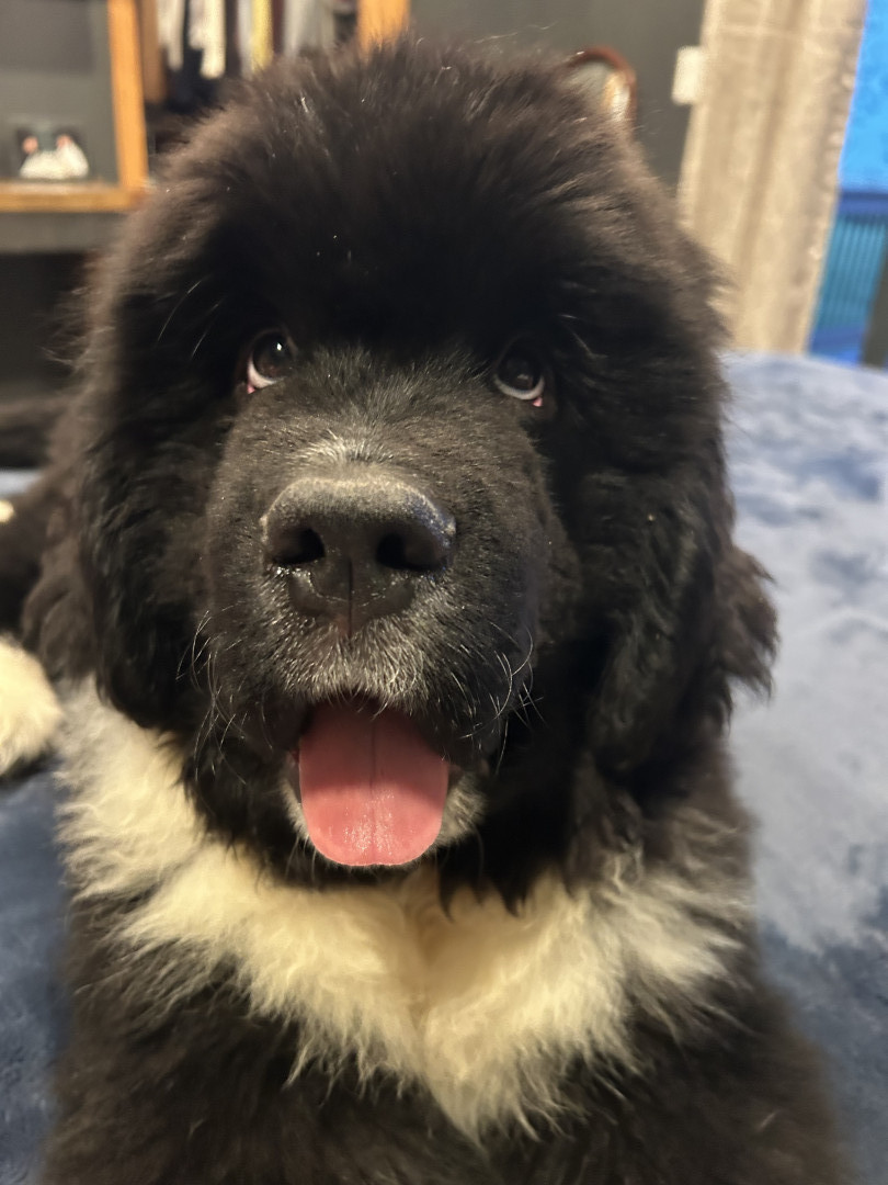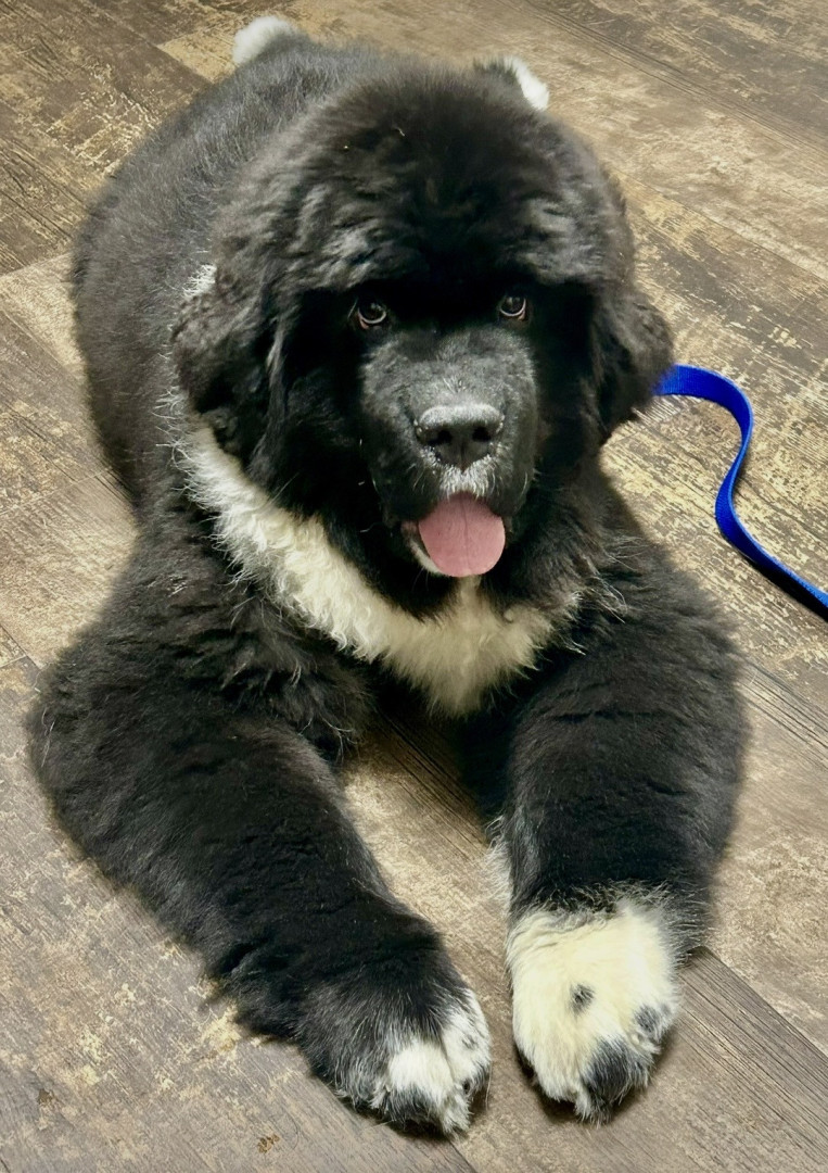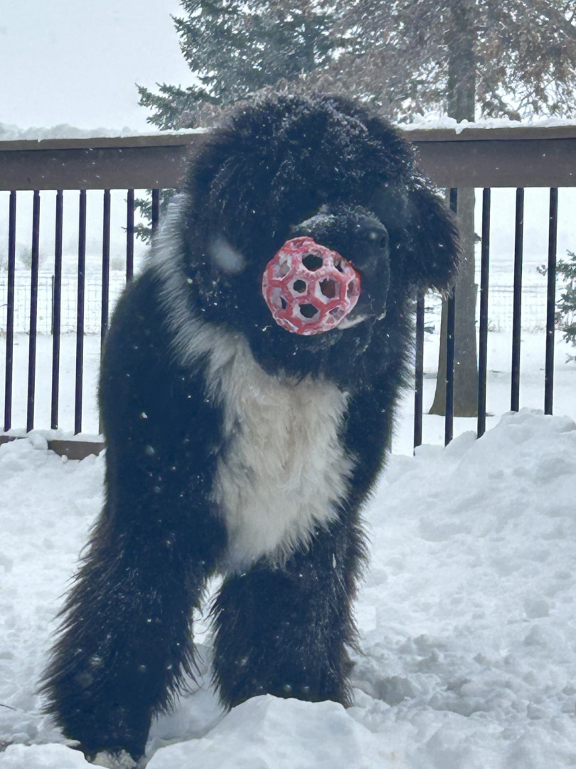 Meet our youngest Newf, Clarence!125 lbs of fluff and growing! With markings of white boots & scarf he’s always ready for his favorite-snow!