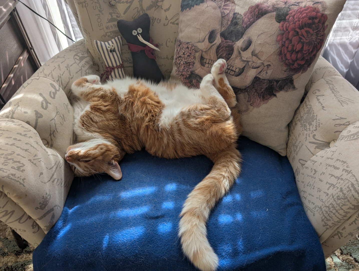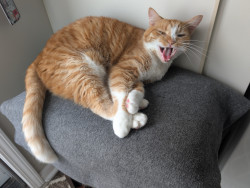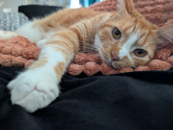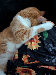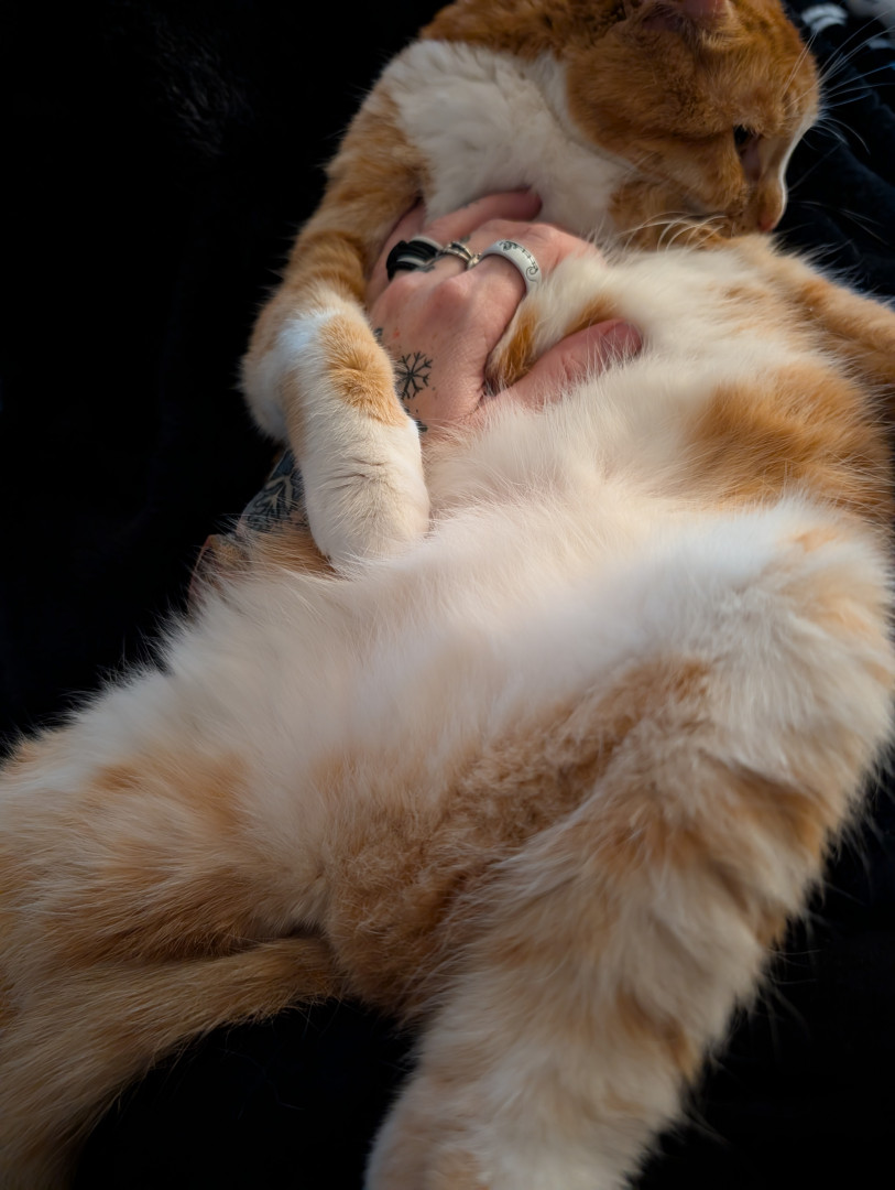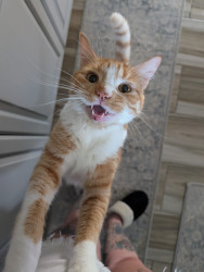 She's 8, spunky, sweet, crazy, loves salad, bacon, catching mice, talking, getting into EVERYTHING, adopted her at 7.