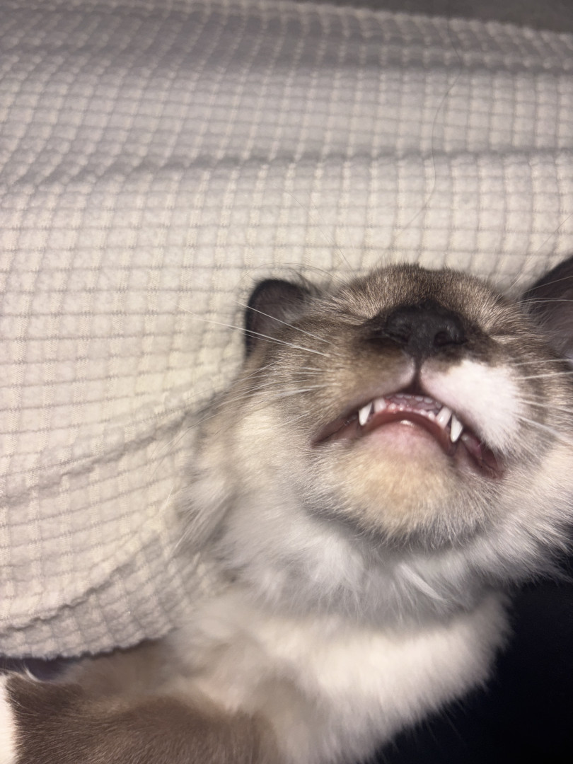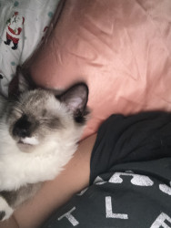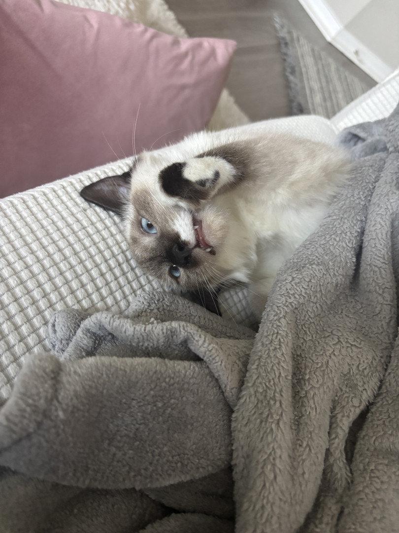 Cleo has a unique look and silly personality. She’s half Siamese half ragdoll giving her a mix personality of silly, fun, but also very cuddly allowing her mom to just pick her up and cuddle her whenever.