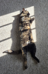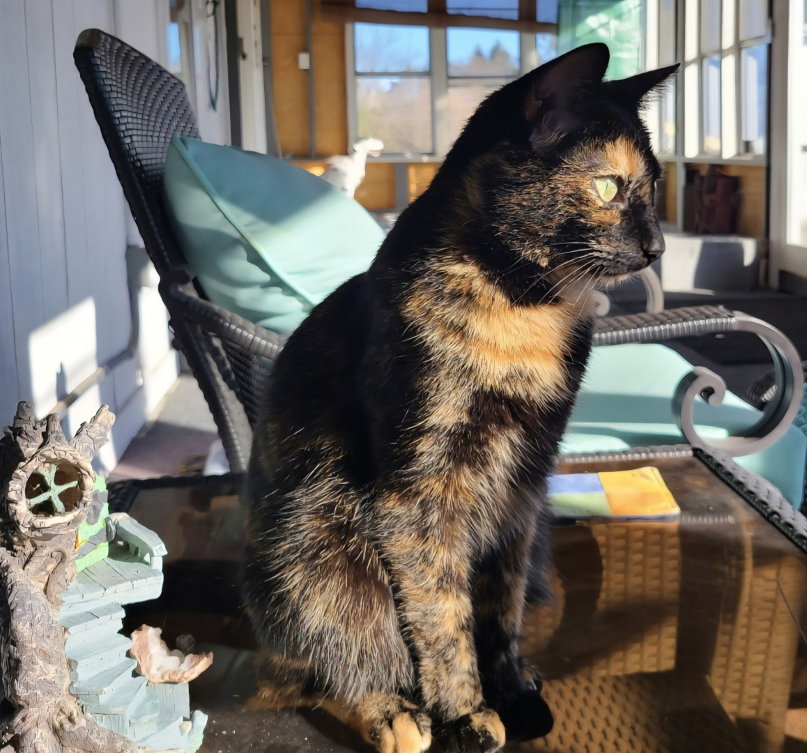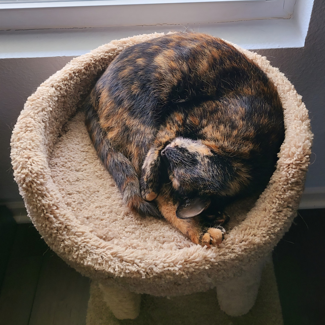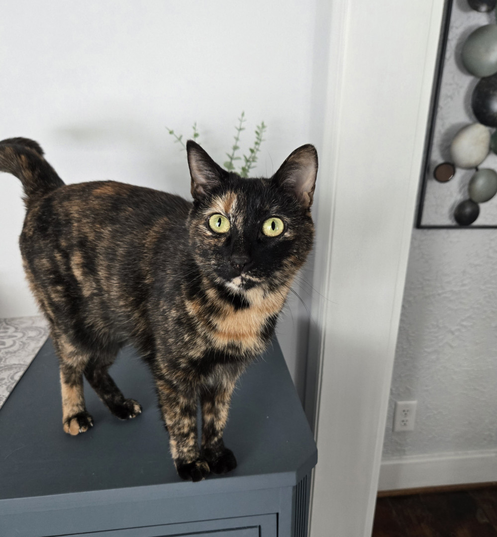 Cleo was a wee small stray who picked her forever home. She is a beloved pet, grandcat, and sister to our dogs. Cleo is silly, smart and an excellent cuddle cat. After three moves she once again protects the home as if she were a dog. She purred her way into our hearts and she will purr her way into yours!