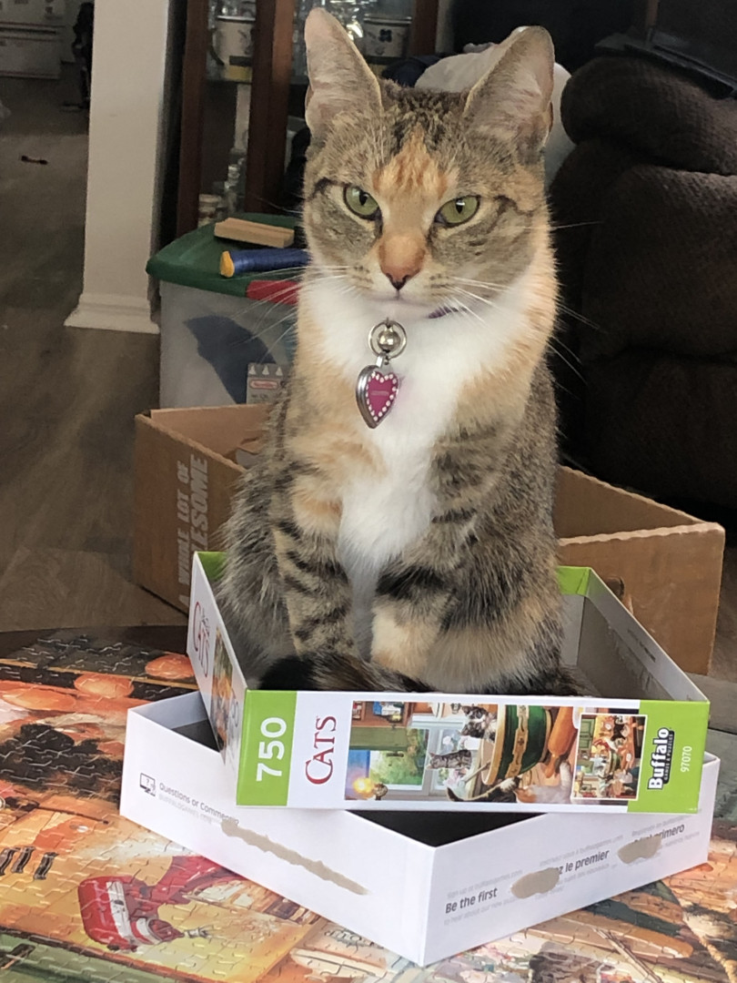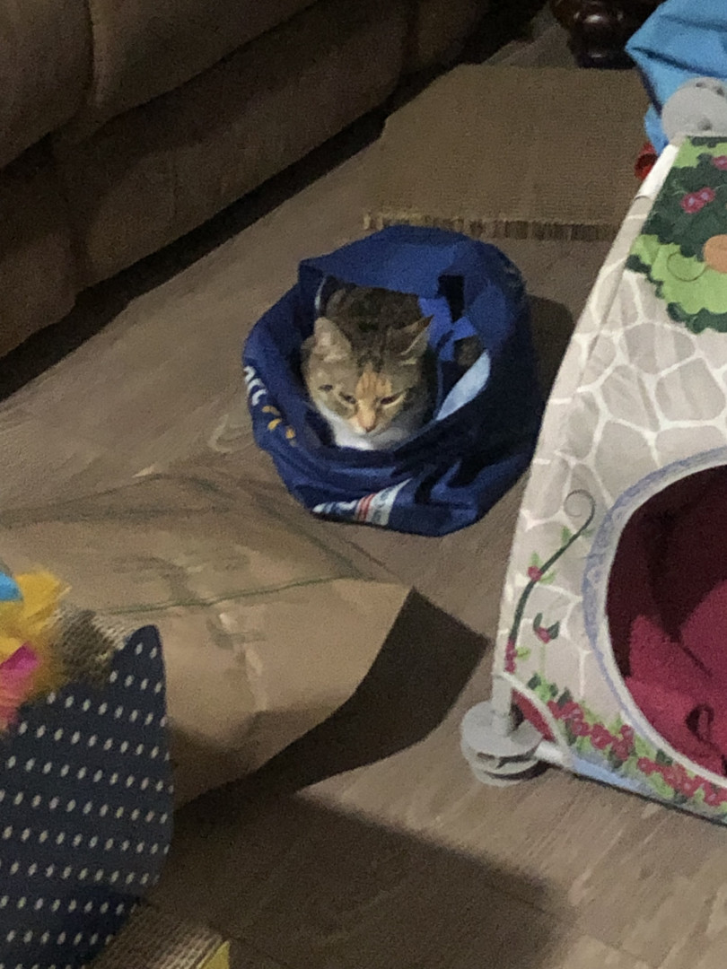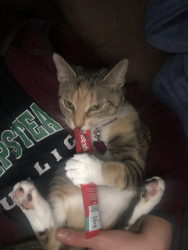 Miss Cleo loves her feathers and strings her new fav are sticks she chases and carries around the house