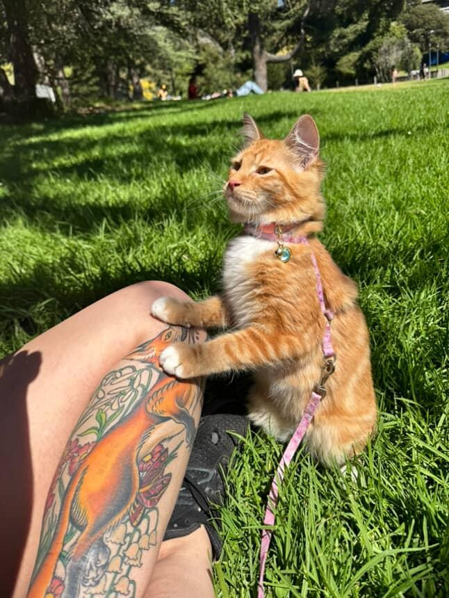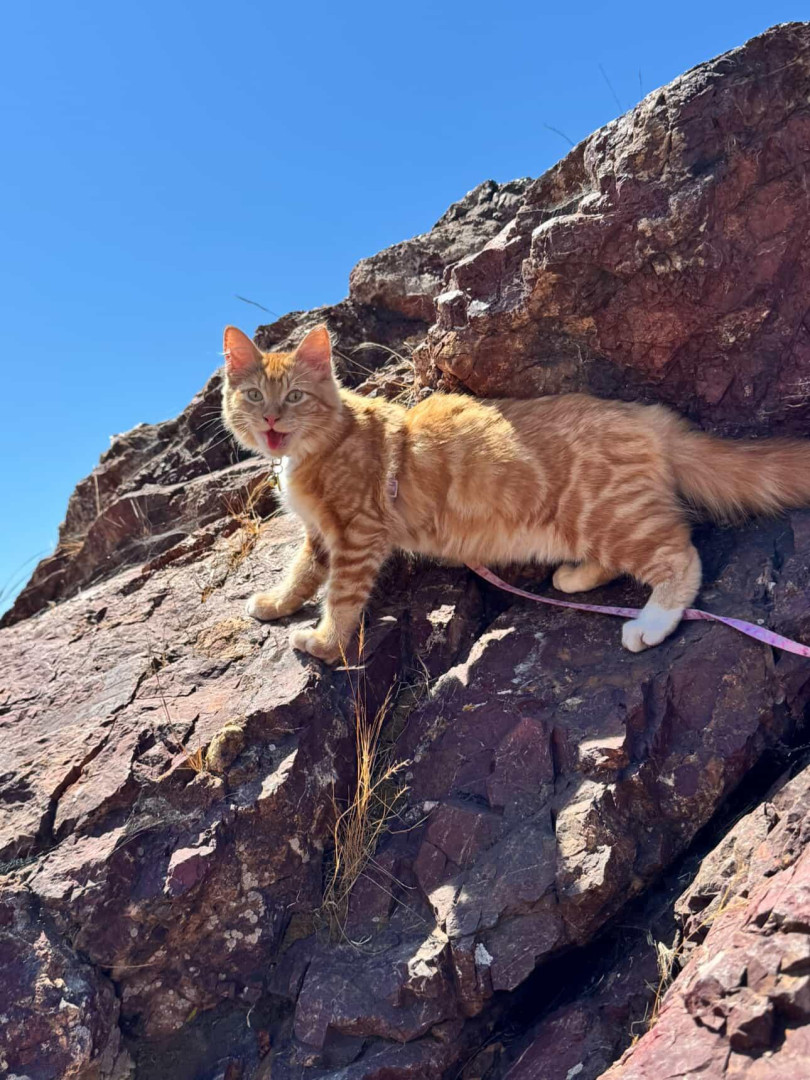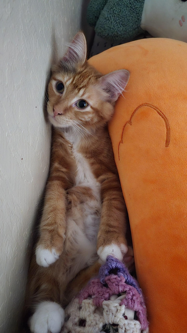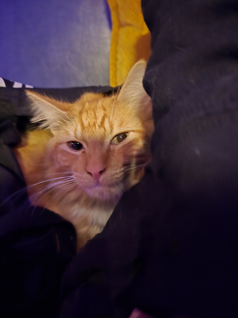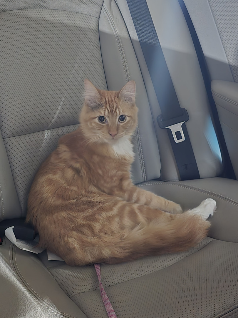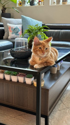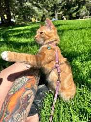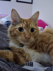 orange, handsome, medium haired, adventure kitty. mommas boy. very smart!!