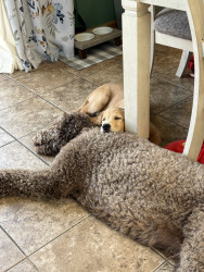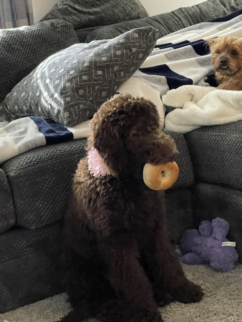 Cocoa should be America’s Favorite because of her sweet, fun, loving personality. She’s full of nicknames such as puffy, cocoa puff, poopy, Big puppy, Kookie, and poodle puff! She loves to swim, play with other dogs, cuddle, EAT, people watch, and go on adventures. Not only is Cocoa an adorable Labradoodle, she’s an amazing pup who we love so much!