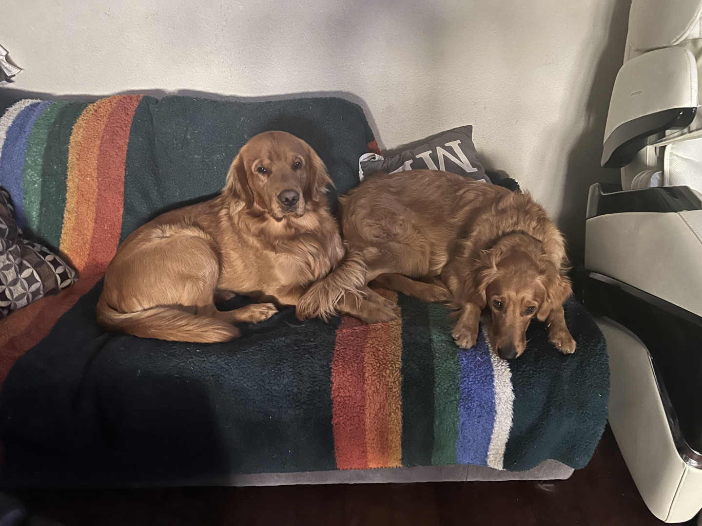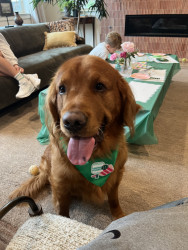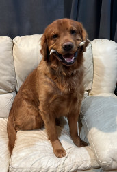 Cooper is very lovable and loves to meet you at the door with a toy. Loves his walks with his Digsby.