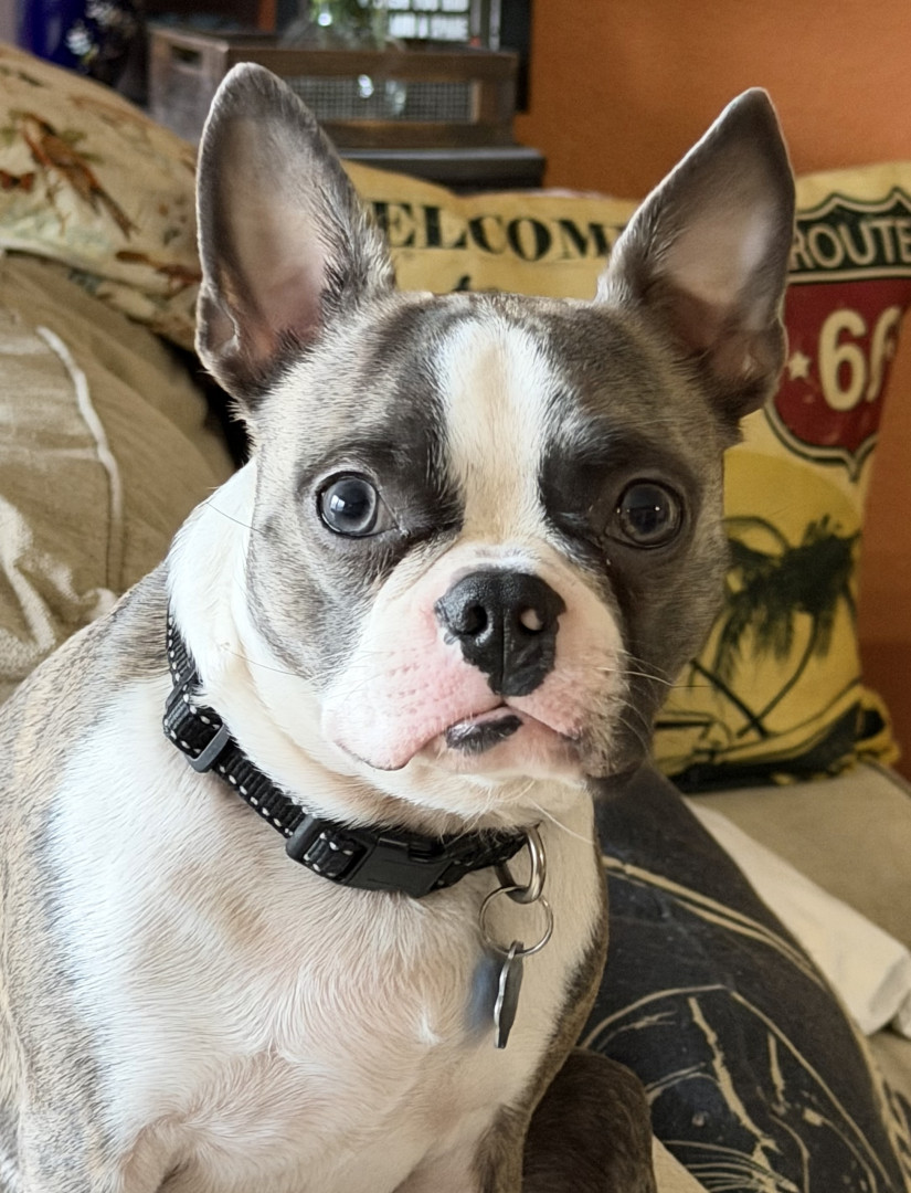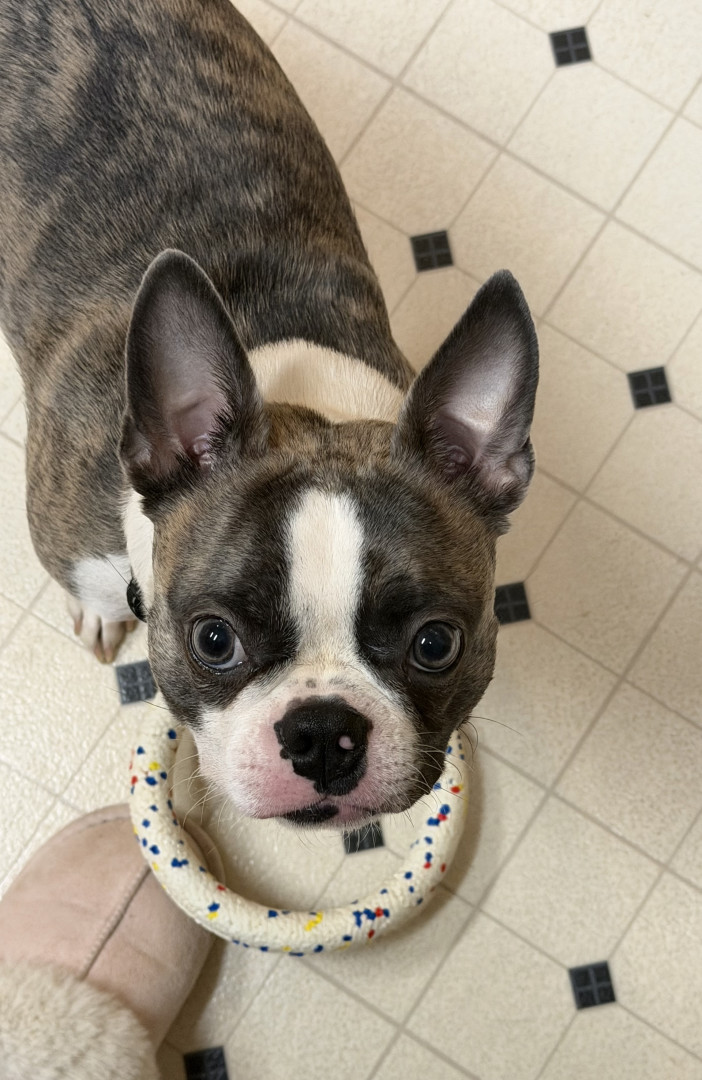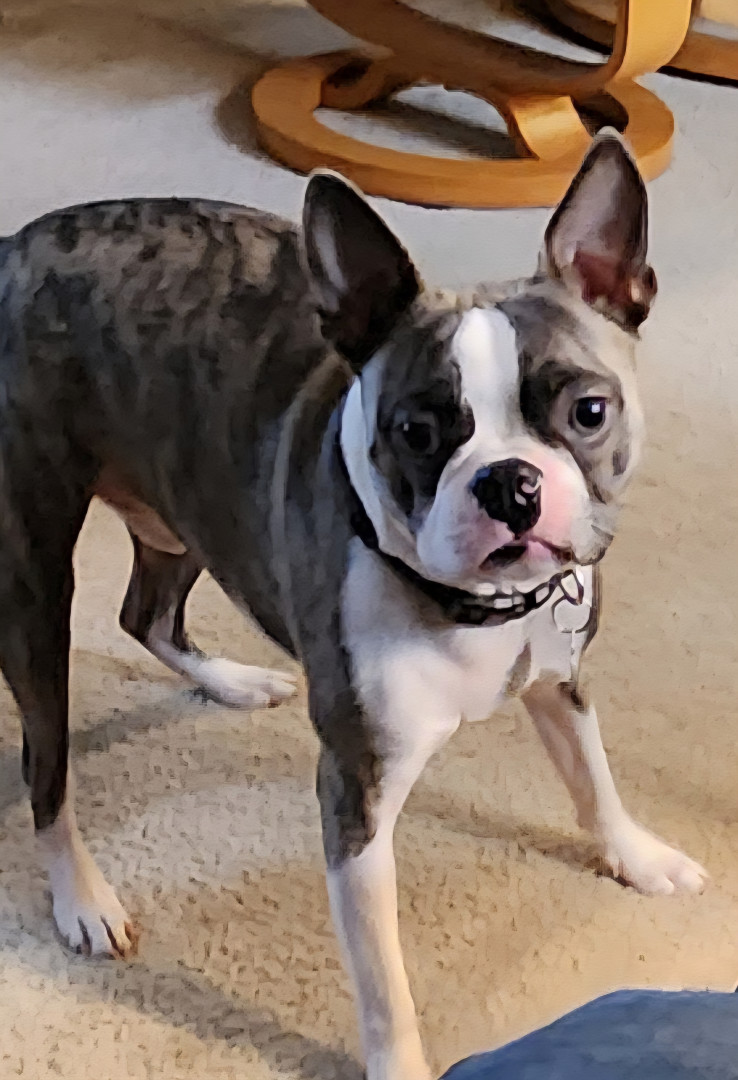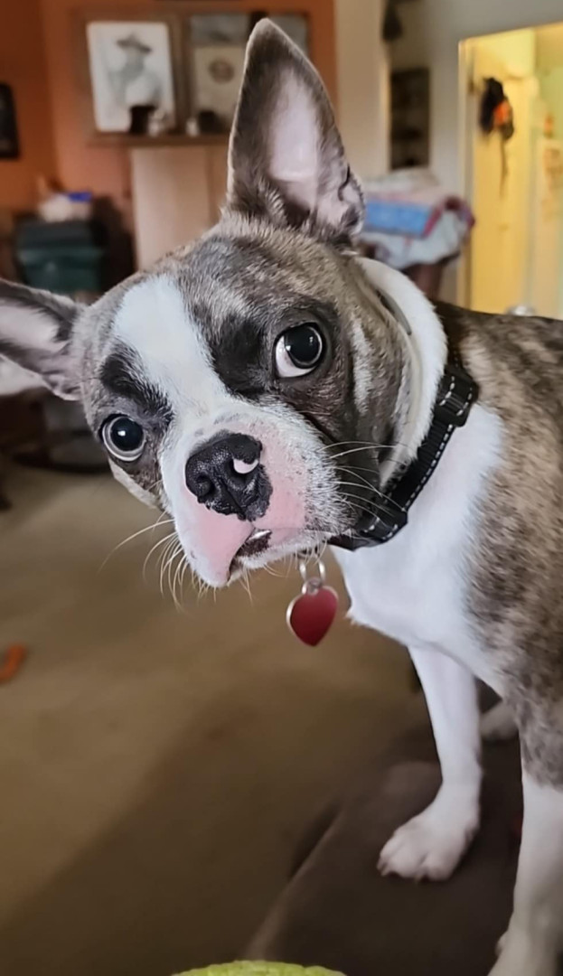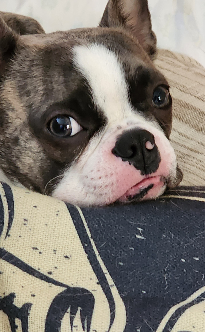 Cosmo is a Boston Terrier, who is a brindle and white bundle of chaos and joy. Being his goofy self brings us much companionship.