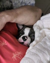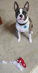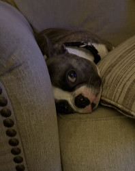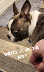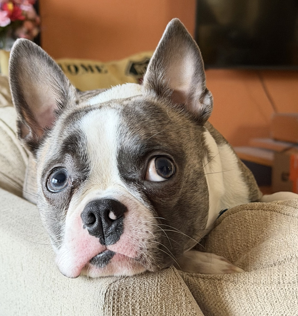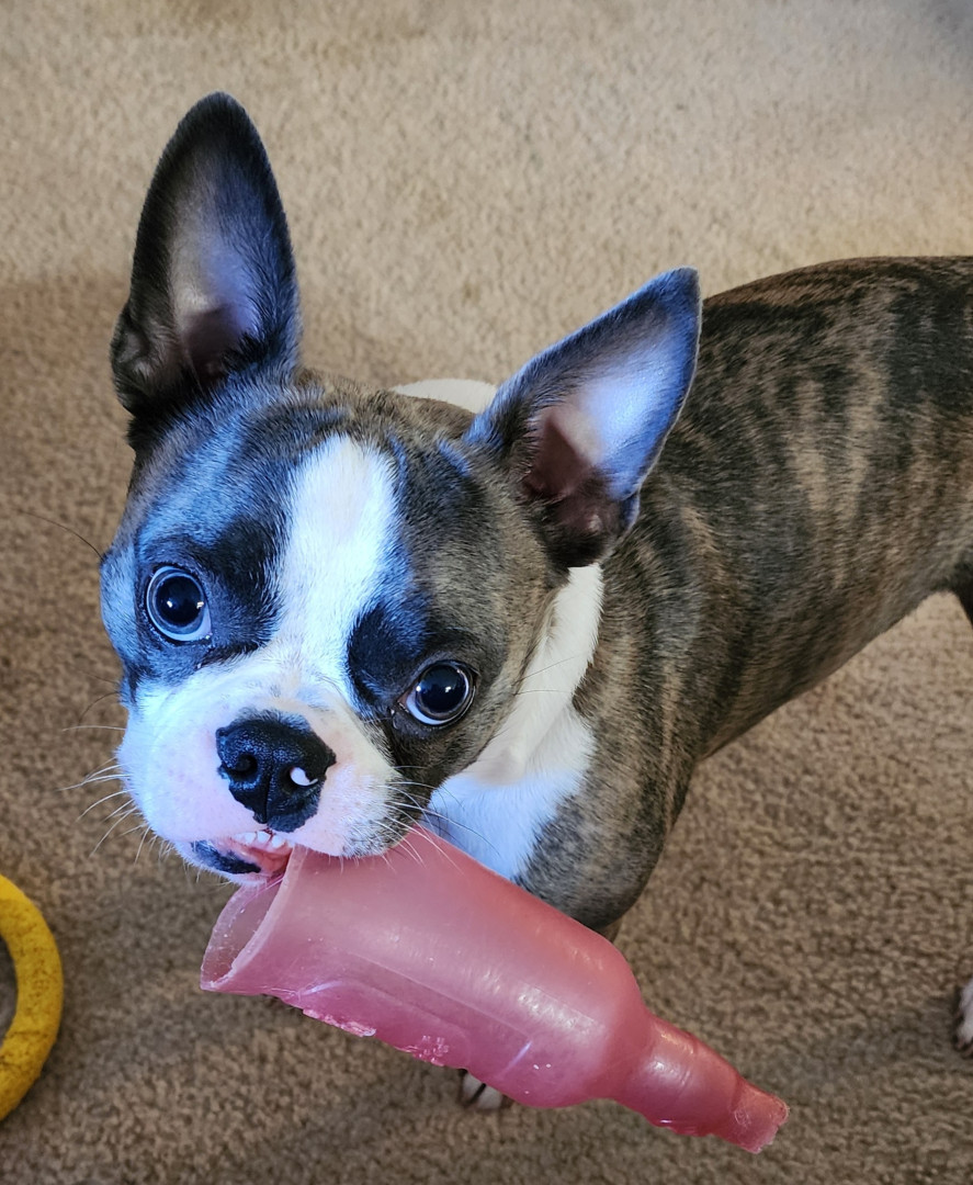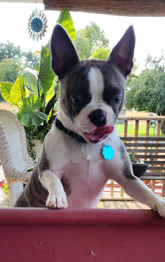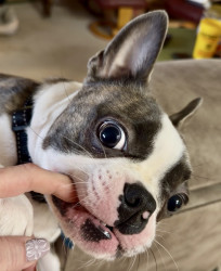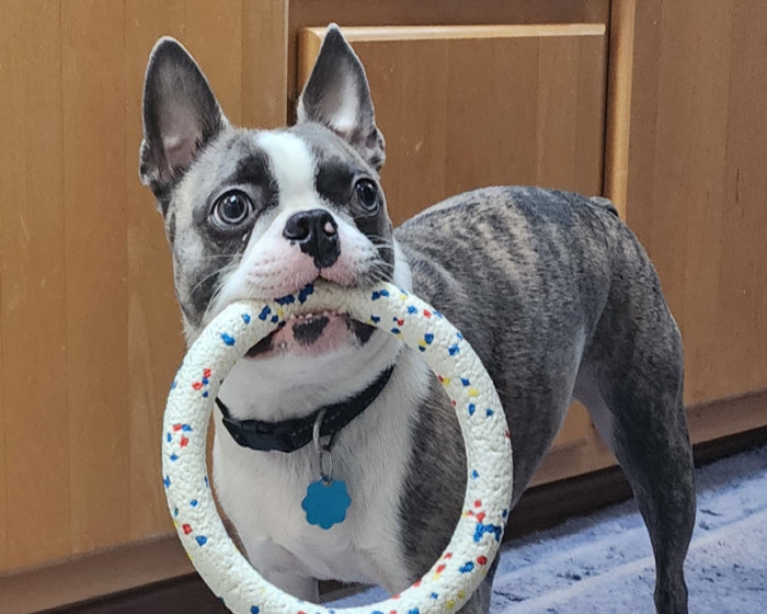 Cosmo is a Boston Terrier, who is a brindle and white bundle of chaos and joy. Being his goofy self brings us much companionship.