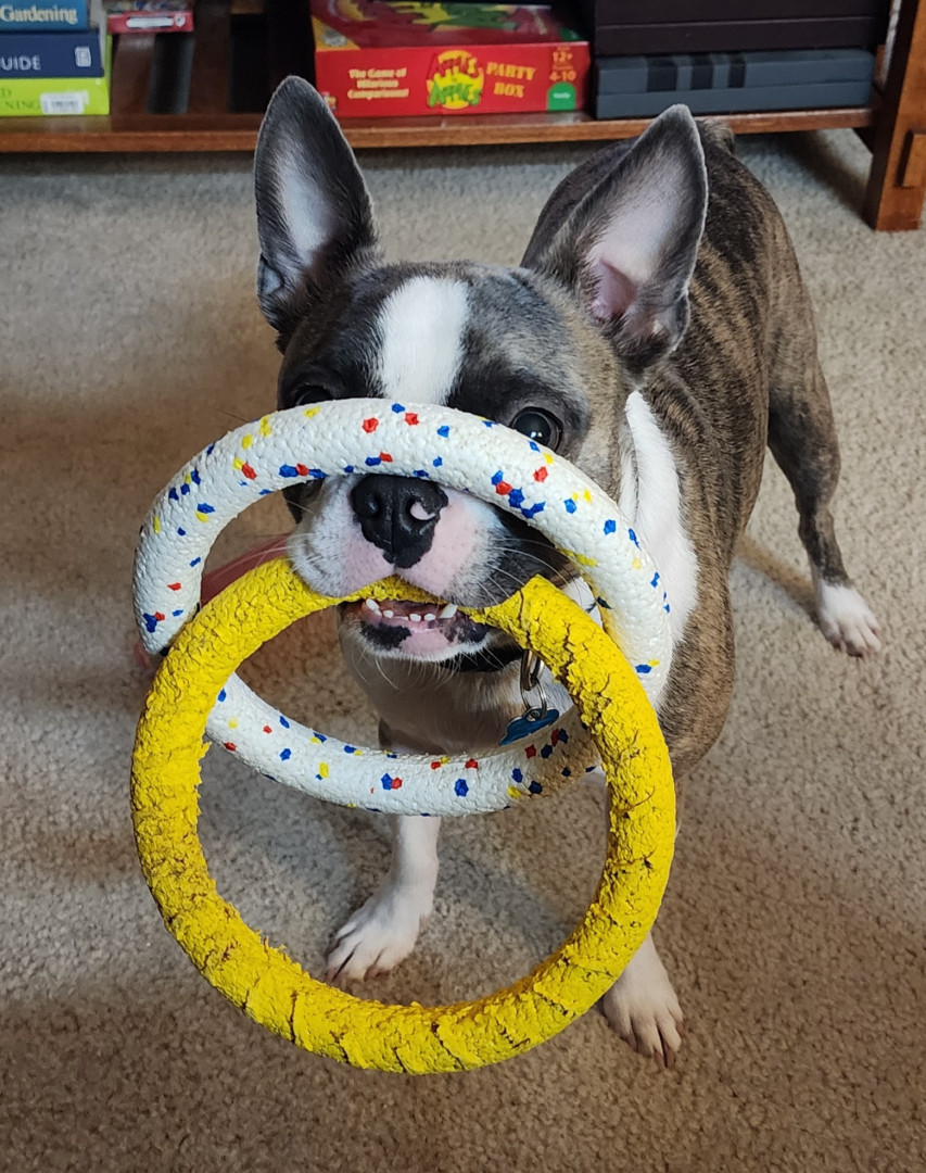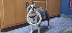 Receive Text UpdatesFor Cosmo, "Ring is Everything." Whether launching himself in the air to catch it, or chasing it down and doing a victory lap, the rubber ring is his companion. He has the focus of an Olympic athlete, at least until he sees a snack. We question Cosmo's genetic backgraound because we're pretty sure he's 25% mountain goat, because when it comes to treats, he gives them all equal opportunity.