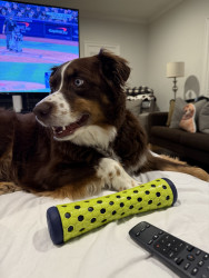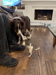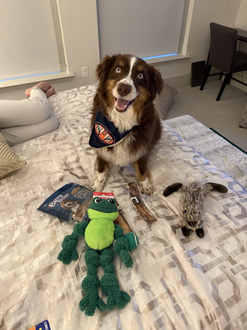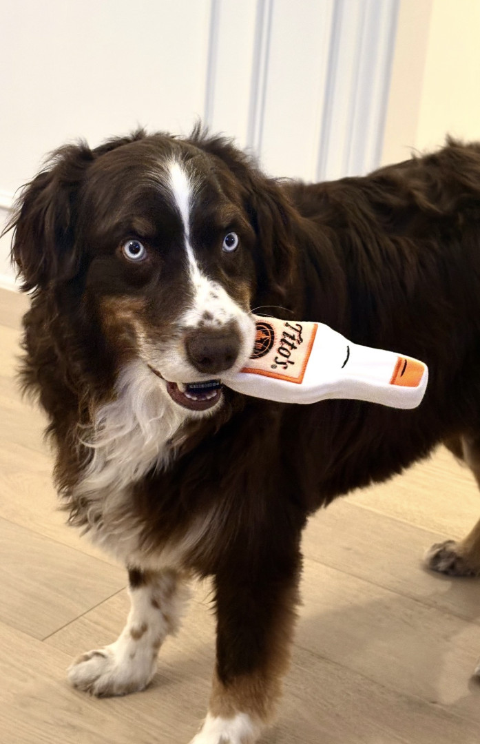 Receive Text UpdatesCosmo’s favorite toy is his Tito’s Vodka plushy, which he proudly carries around and plays with every chance he gets. It perfectly matches his playful and quirky personality. When it comes to treats, nothing beats his go-to favorite—a rich, savory bone marrow bone from Central Market. Whether he’s tossing his plushy or enjoying his favorite snack, Cosmo knows how to live his best life.