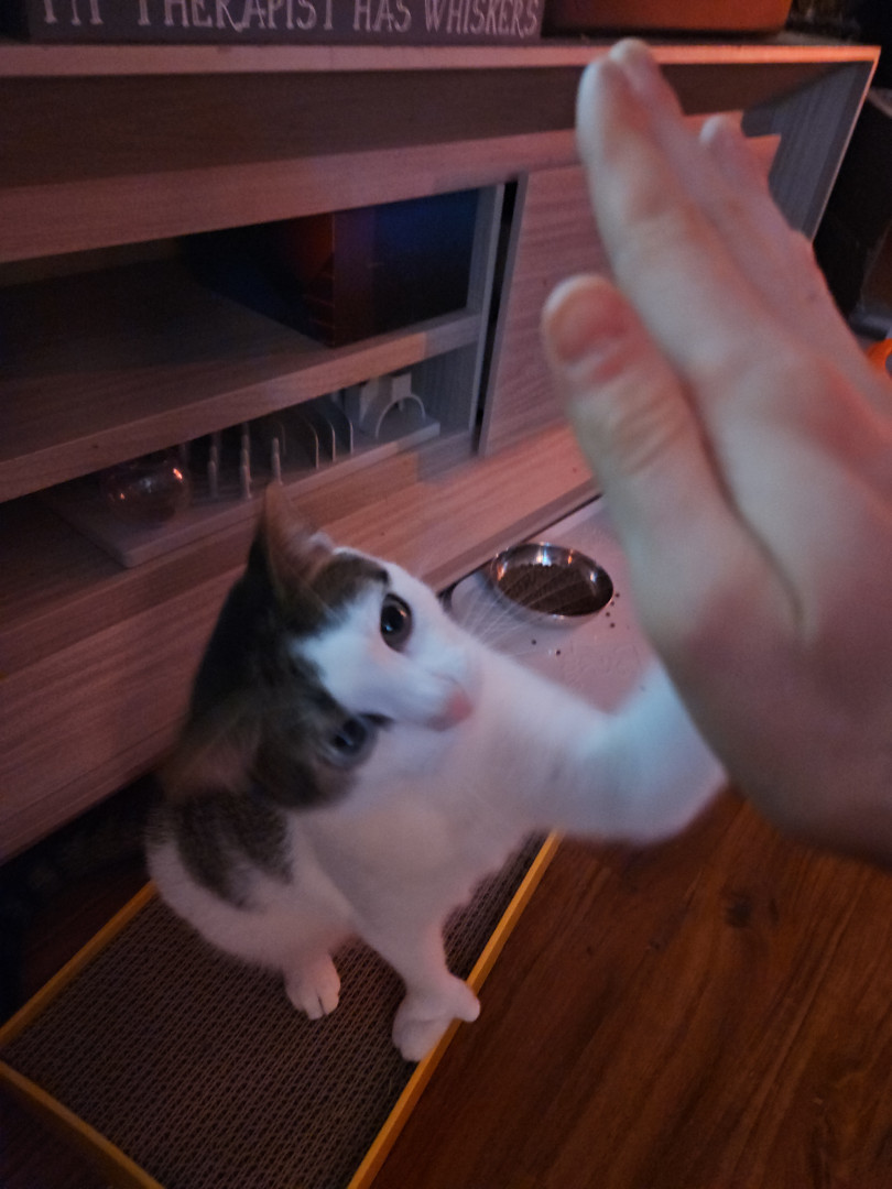 Luxurious short-haired fur coat in a classic tabby-and-white pattern—soft, dense gray stripes swirling over his back and sides like marble, contrasting beautifully with pristine white on his chest, belly, paws, and face, creating a tuxedo-like elegance that accentuates his heterochromatic eyes (one blue, one green, a rare trait in <1% of cats); his polydactyl paws feature 24 total toes with extra thumb-like digits for superior grip; he showcases intelligence by mastering high fives and commands.