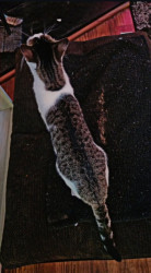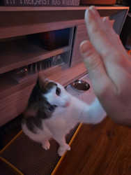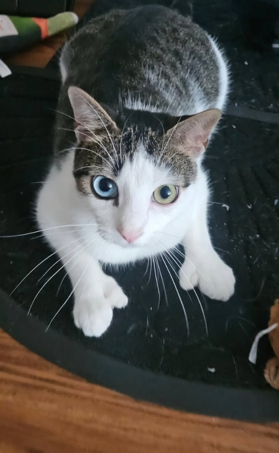 1 year old mesmerizing tabby with one sapphire eye and one emerald, boasts majestic mitten paws—six toes each, 24 velvet beans in all.