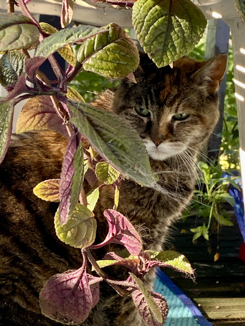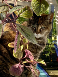 21 years old. Lovey to some. Indoor cat but will sit with us if we are sitting on the second story balcony. Enjoys sleeping on the keyboard.