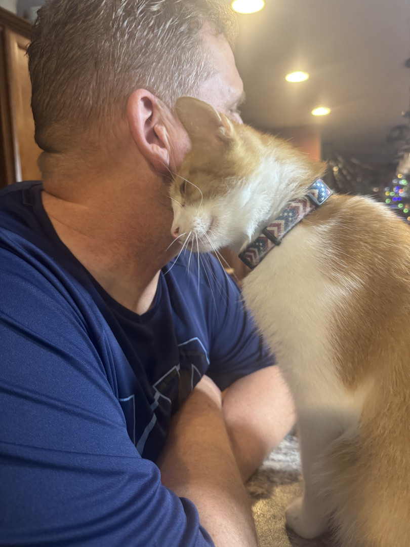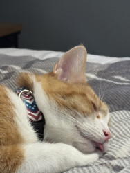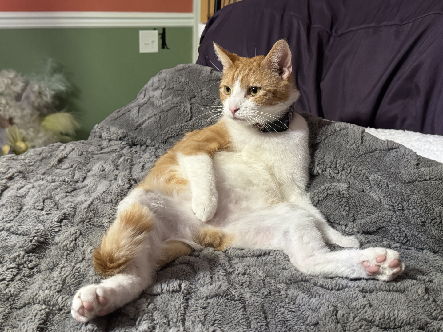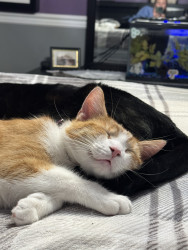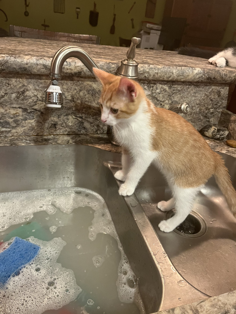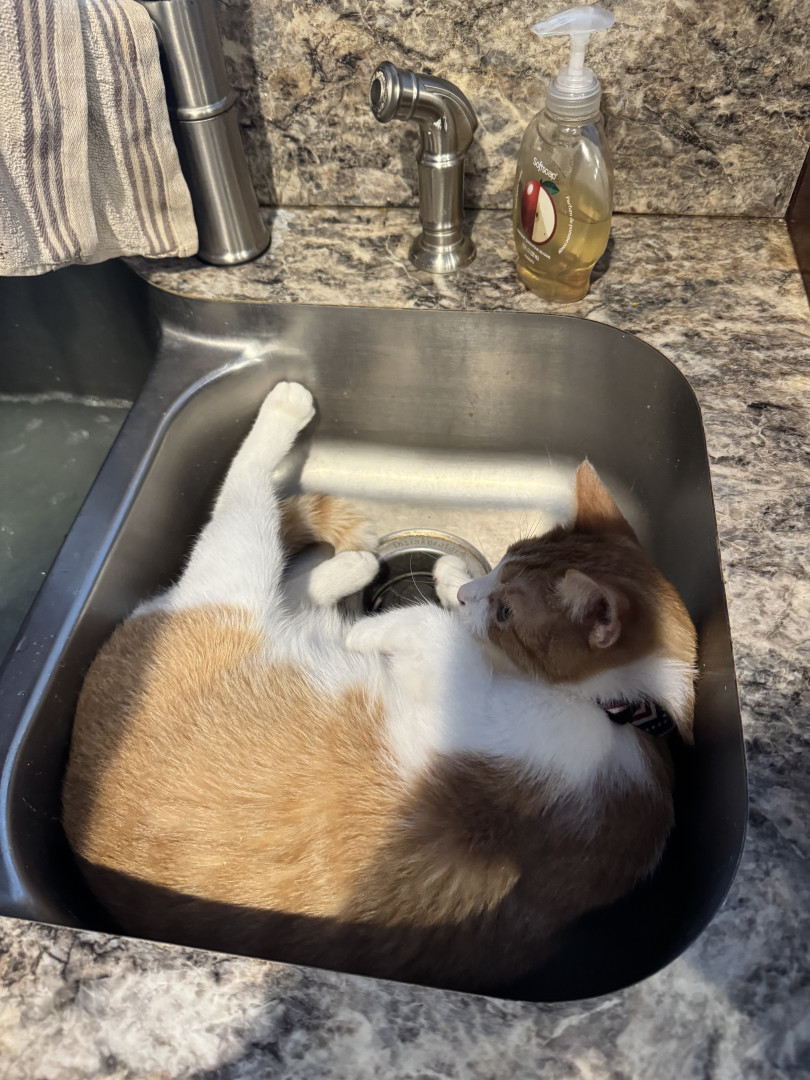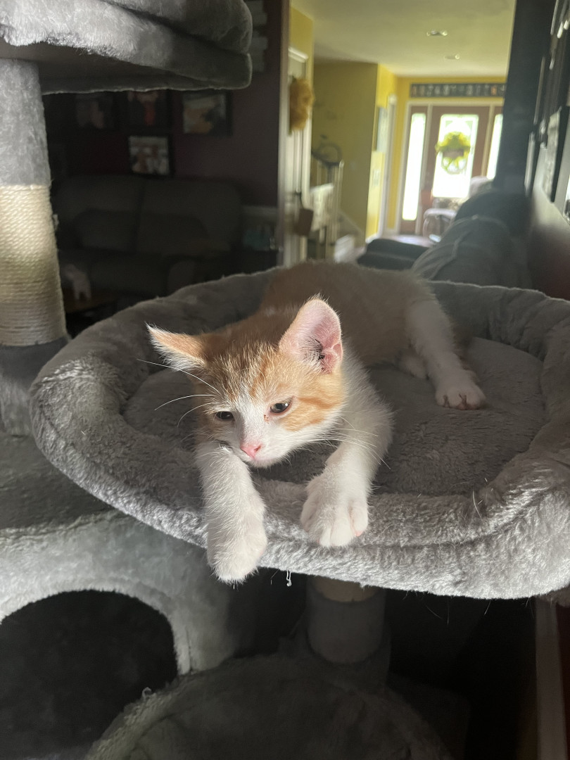 He is the life of the party and doesn’t even know it. He is always in the middle of everything. He can be found on our bed lounging, snuggling with his siblings, under the blankets, or curled up with his humans. He likes to help make the bed by getting under the sheets and wants you to make the bed so he can’t get out. He likes to play in the sink whether it’s just for fun or helping washing dishes. We have to keep bread locked up because if he gets a hold of it he will eat the whole loaf.