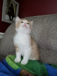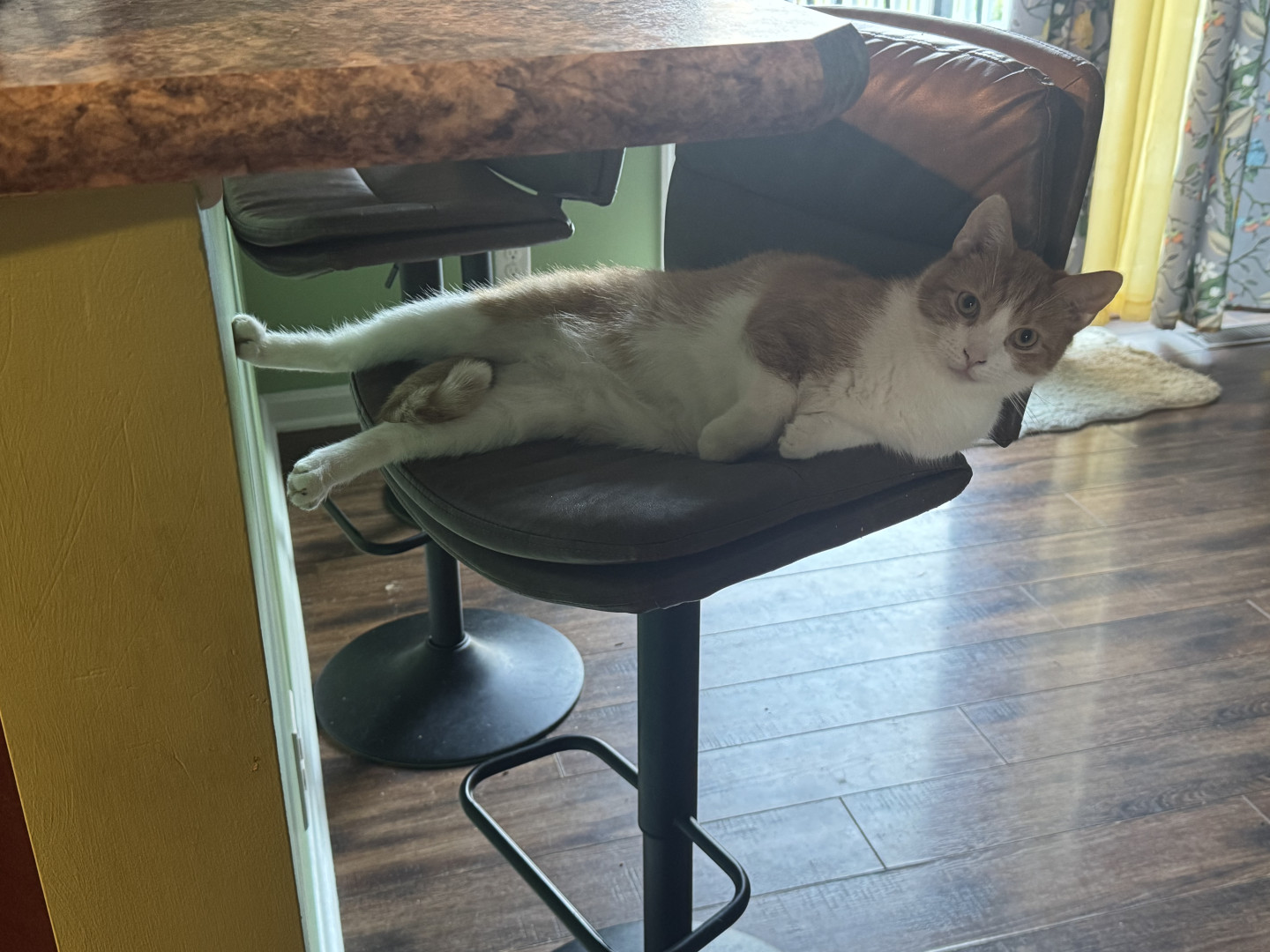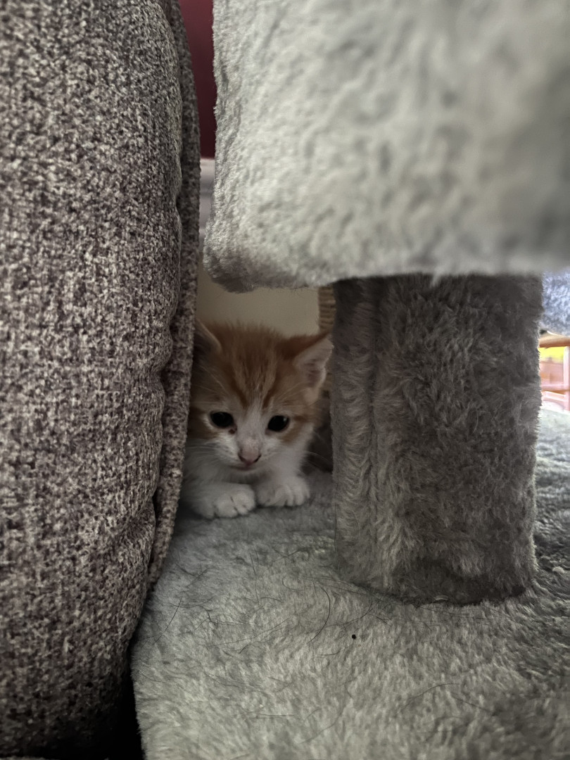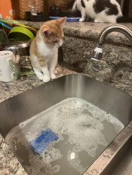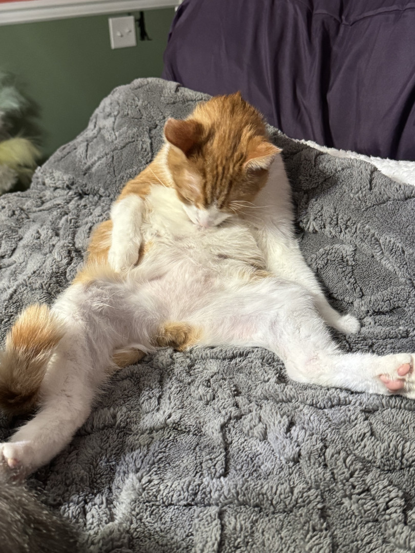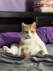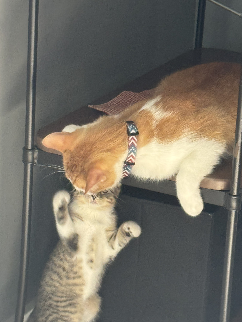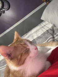 He is the life of the party and doesn’t even know it. He is always in the middle of everything. He can be found on our bed lounging, snuggling with his siblings, under the blankets, or curled up with his humans. He likes to help make the bed by getting under the sheets and wants you to make the bed so he can’t get out. He likes to play in the sink whether it’s just for fun or helping washing dishes. We have to keep bread locked up because if he gets a hold of it he will eat the whole loaf.