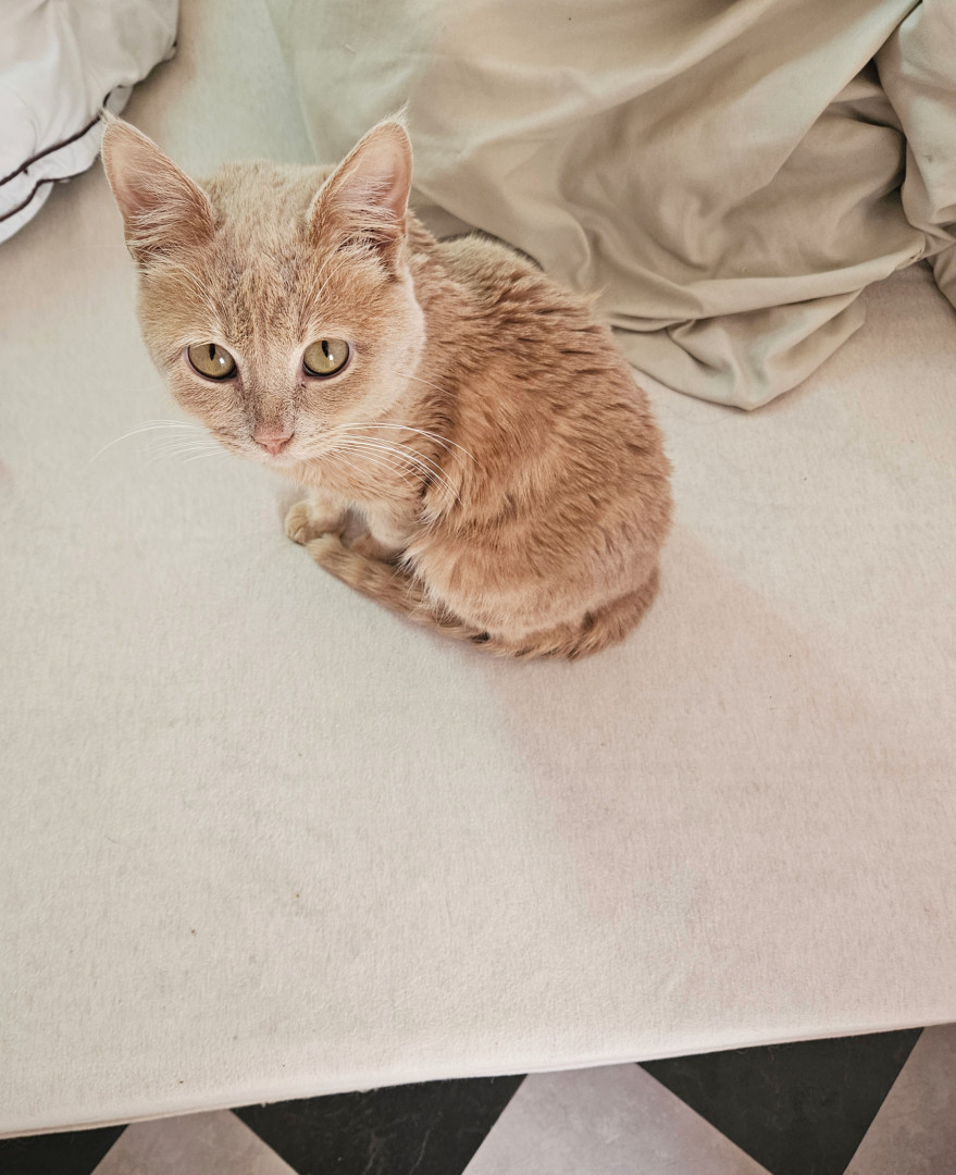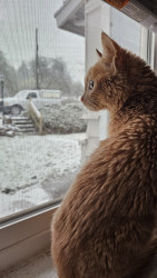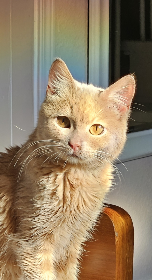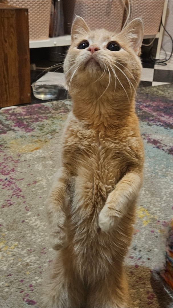 Cubby: dwarf cat, full-time chatterbox,unapologetic snack thief, orange cat braincell hoarder, and professional shoulder-nap baby.