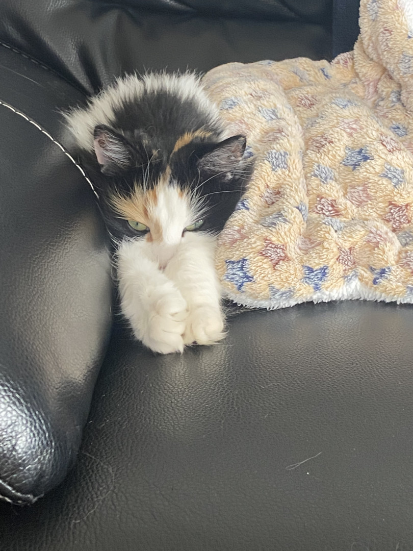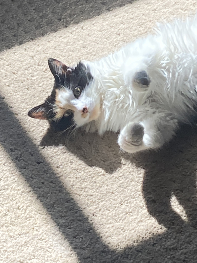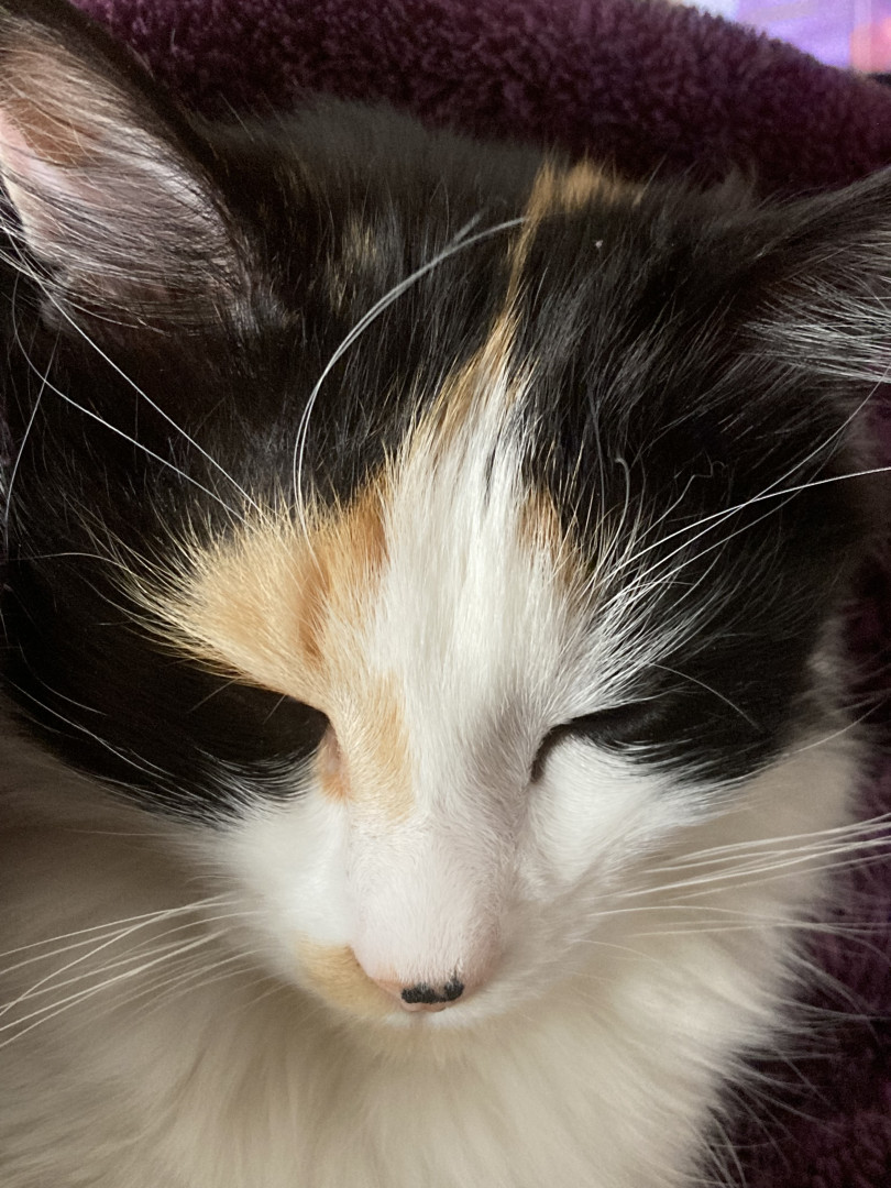 Daisy is one of a kind. Her mom is a short haired grey cat and her dad is an orange tabby. Daisy is a beautiful long haired calico so she’s special. Just like everyone of us. She’s my little familiar. My best friend.