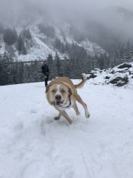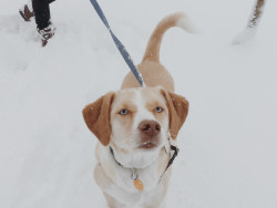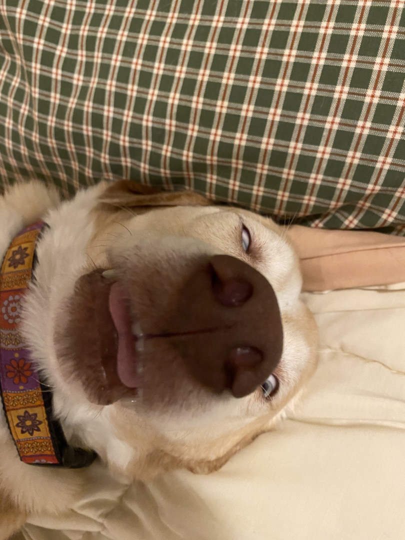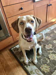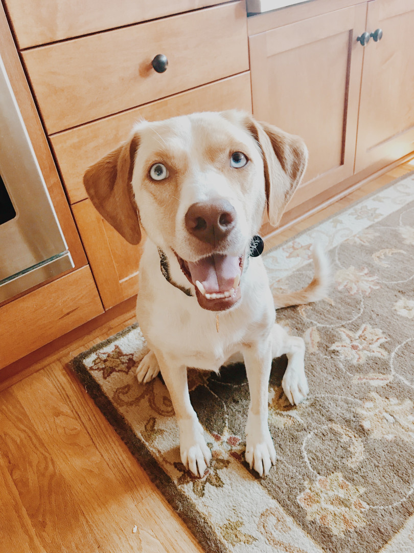 Daisy is part husky but looks more like a yellow lab. She does, however, have the blue husky eyes and a big husky tail and does howl instead of bark. Daisy never barks but if it is past her 5pm dinner time, you will start to hear howling (or if you put outside shoes on without taking her with you). She also spends an insane amount of her life upside down begging for belly rubs.