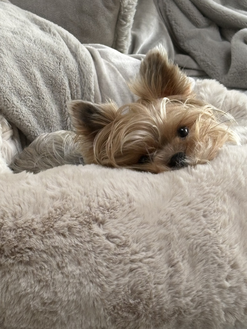 Daisy is the sweetest and most snuggly little dog I have ever met. She loves to nestle under blankets and has little bouts of play time too