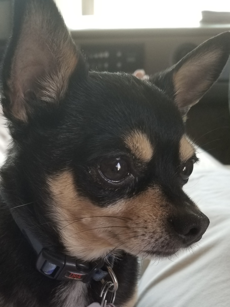 He is the best most well behaved little Chihuahua in the world. He is always down for a walk in any kind of weather, not to mention he had never met a person he doesn't like. He is the best shotgun in a car or flying on a plane. He has the sweetest disposition, never bitten anyone and for a Chihuahua that says a lot. I went through two rough times in my life where I was homeless and Dante got me through some of the darkest moments in my life. He's the best little man ever!