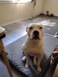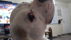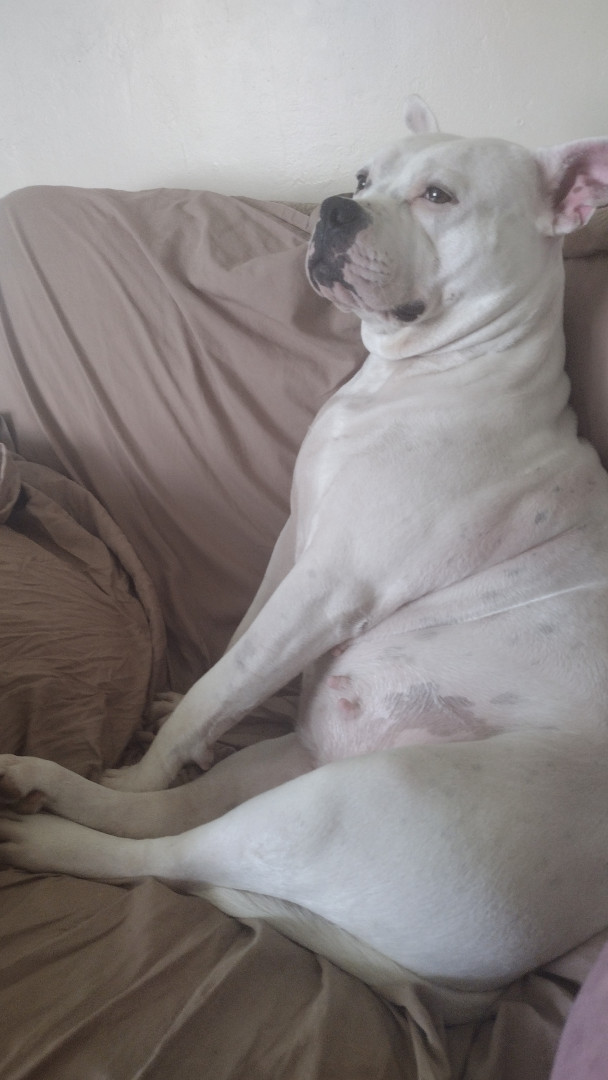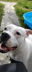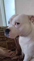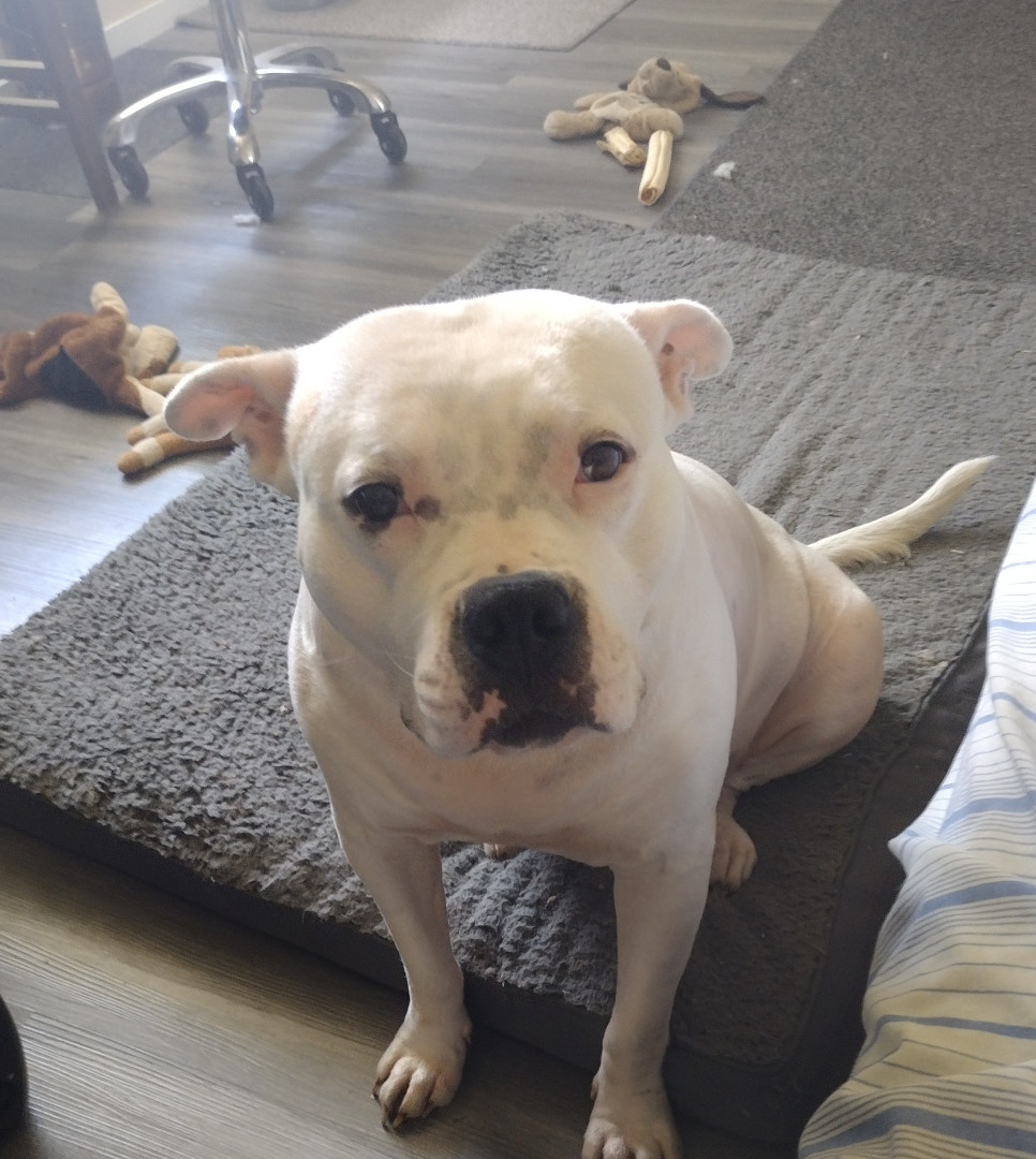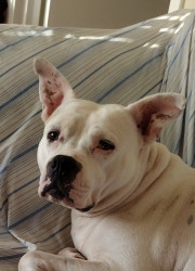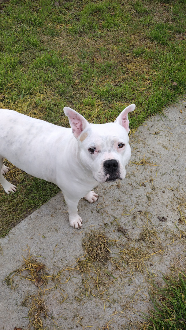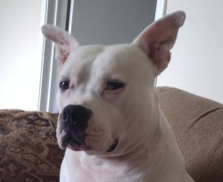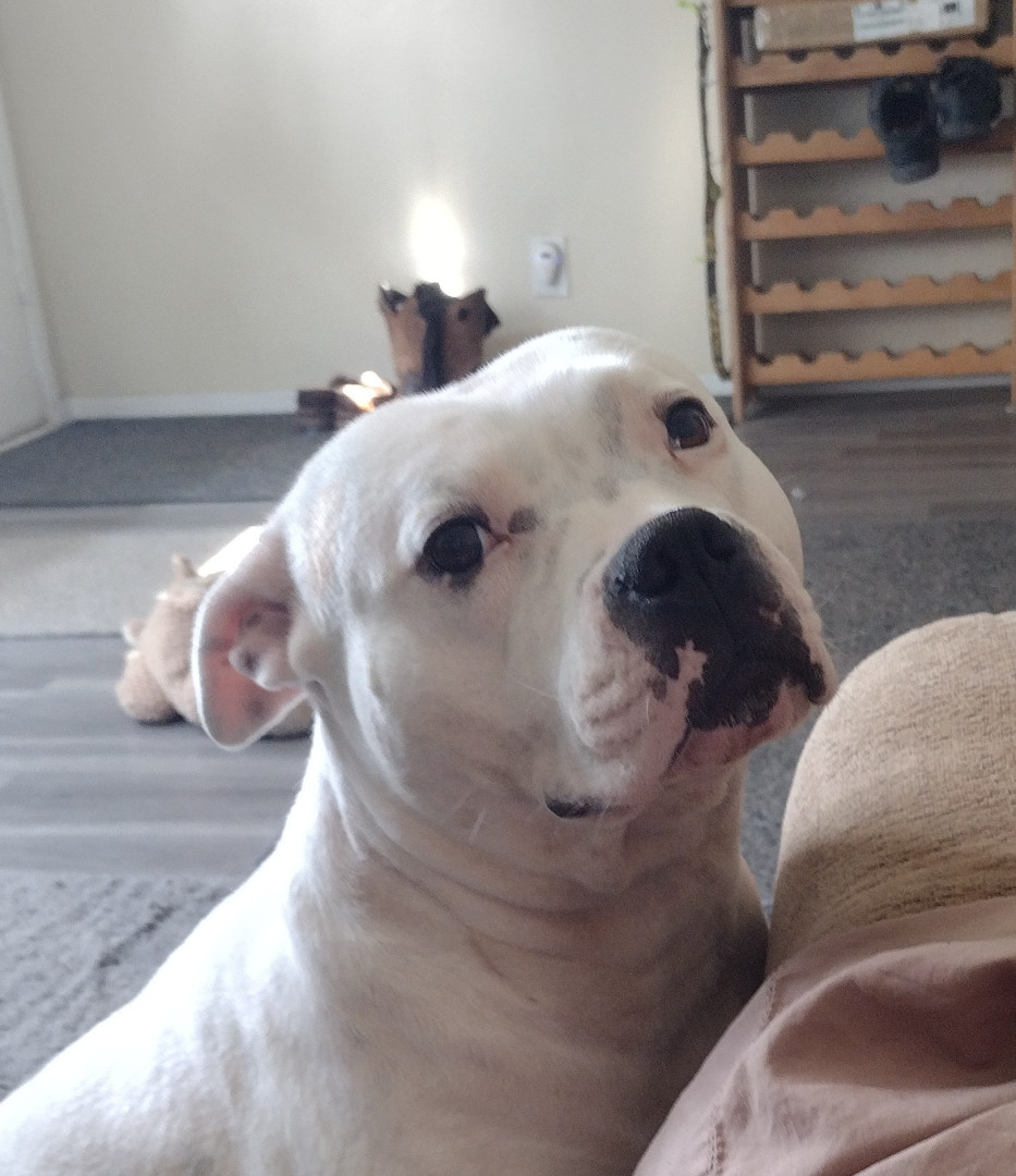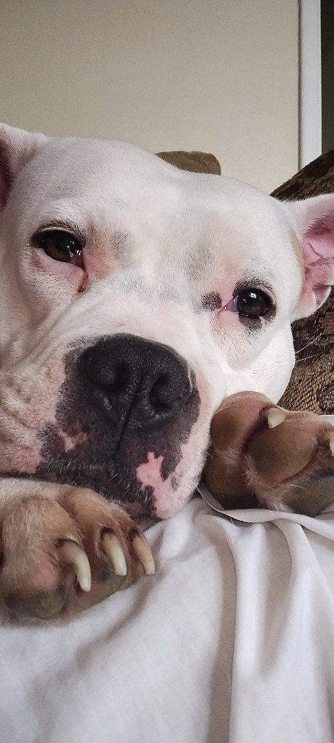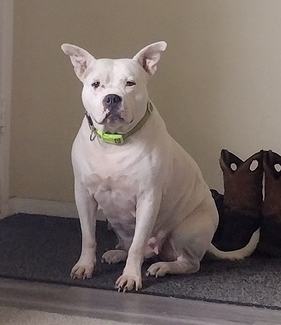She's a lovable Pitbull. She loves watching the Dog Whisperer and John Wick movies. Just look at her precious face..SHE'S GOT SO MANY LOOKS!