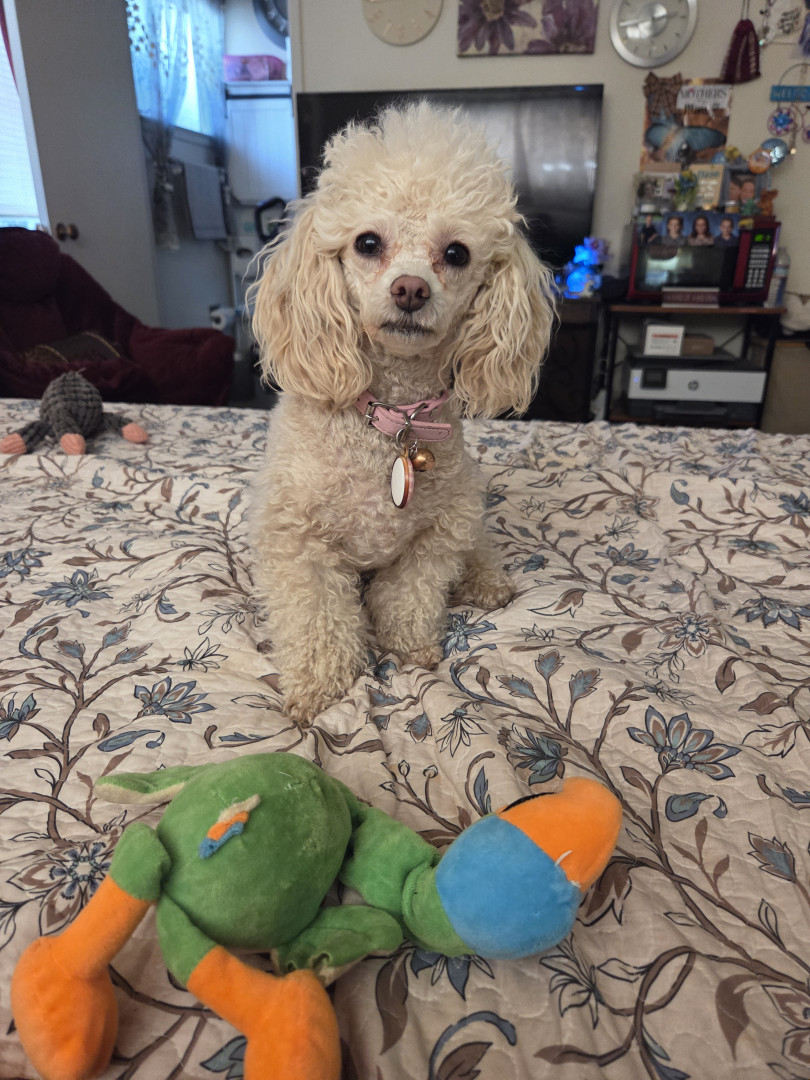 Darla is the most darling beautiful sweet little loving toy poodle!! She reminds me of a little hairy human. She is one little love bug