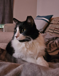Shes loves to be loved. I found her outside when she was just a baby. Never expected her to be loving and doing all the tricks that she does. Tuxedo cats are unique.