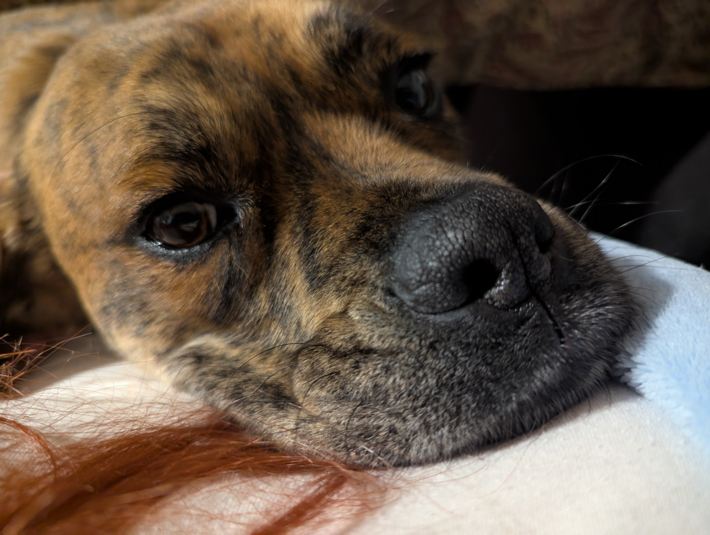 I got Brockie as a puppy from a foster home just a few months after my Buddy passed away. Brockie has encompassed all of the qualities of Buddy even though they have never met. His mannerisms, the way he prances like a deer, the way he rests his head on my lap and stares in my eyes, and his singing healed out family's broken heart. Also his brindle pattern is extremely beautiful and unique like a tiger, he looks like a hyena at times, his coat is puppy soft, and a cut half black and white butt.