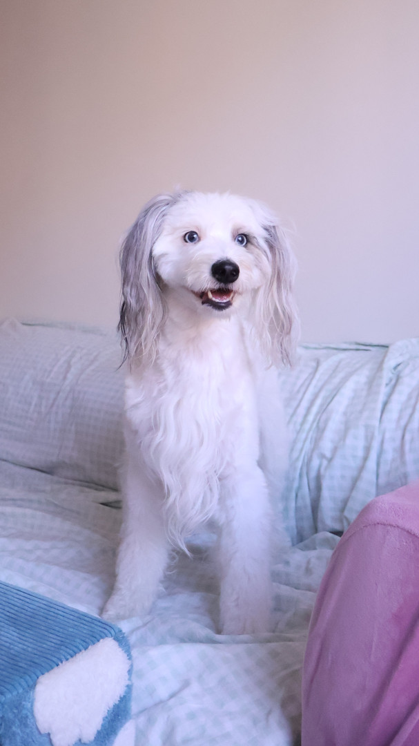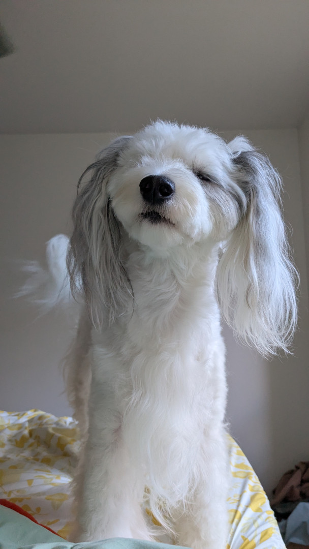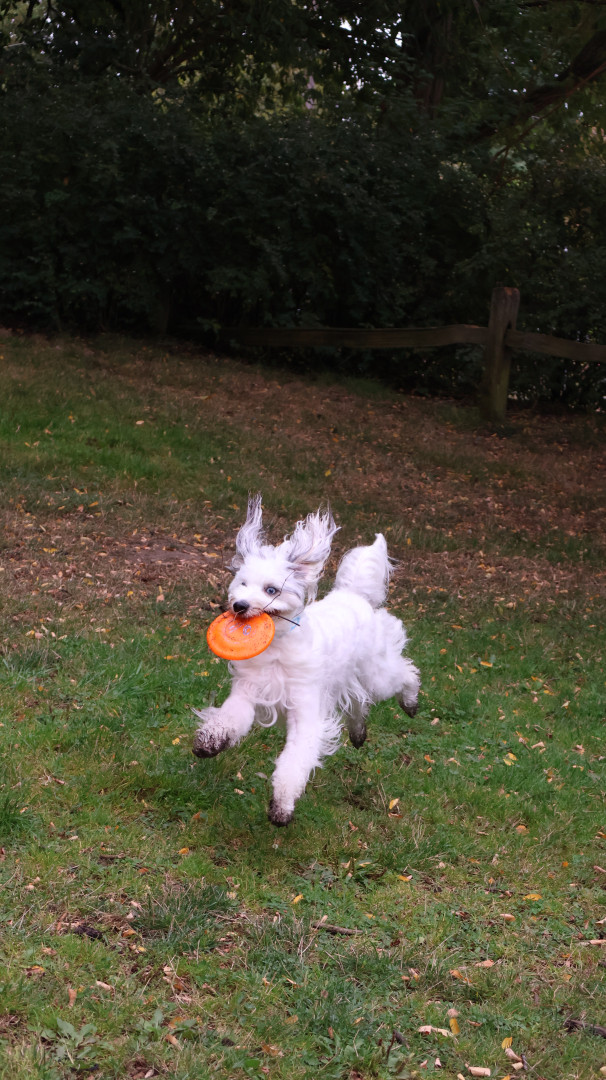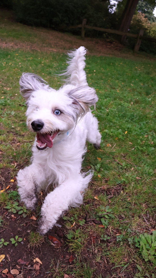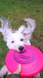 Dee loves life! She loves making friends, playing frisbee, running at max speed, doing tricks, and watching TV like people.
