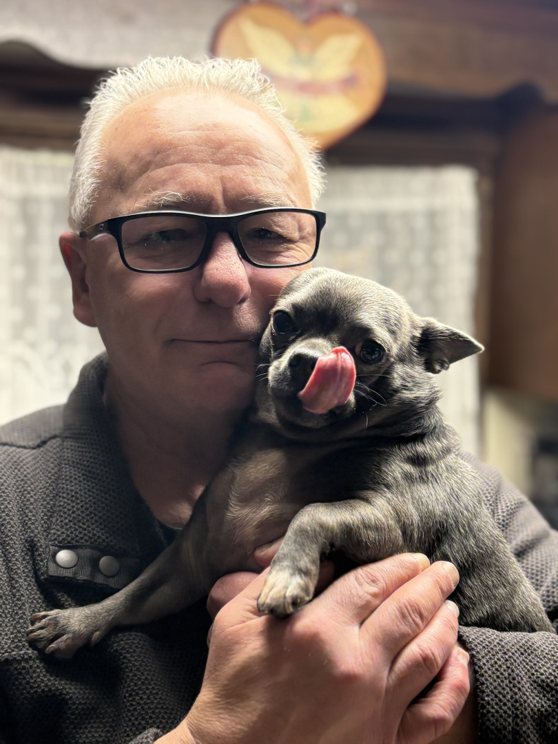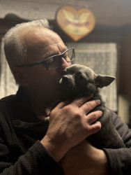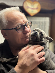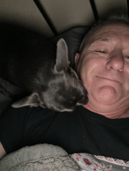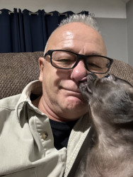 He’s loving and follows me everywhere! even to the bathroom. He knows when I’m stressed or having a bad day because he jumps upon my lap and licks my face to say it’s ok Daddy. He sleeps by my side on his back every night under my arm being secure and giving me his unconditional love and affection.