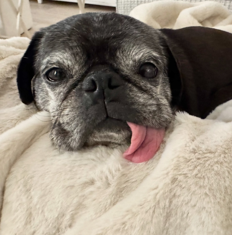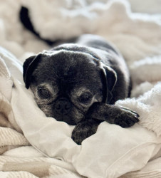 Dennis is a 12 year old pug who loves eating paper towels, playing fetch with his toy carrot, sunbathing, snuggling and looking cute!
