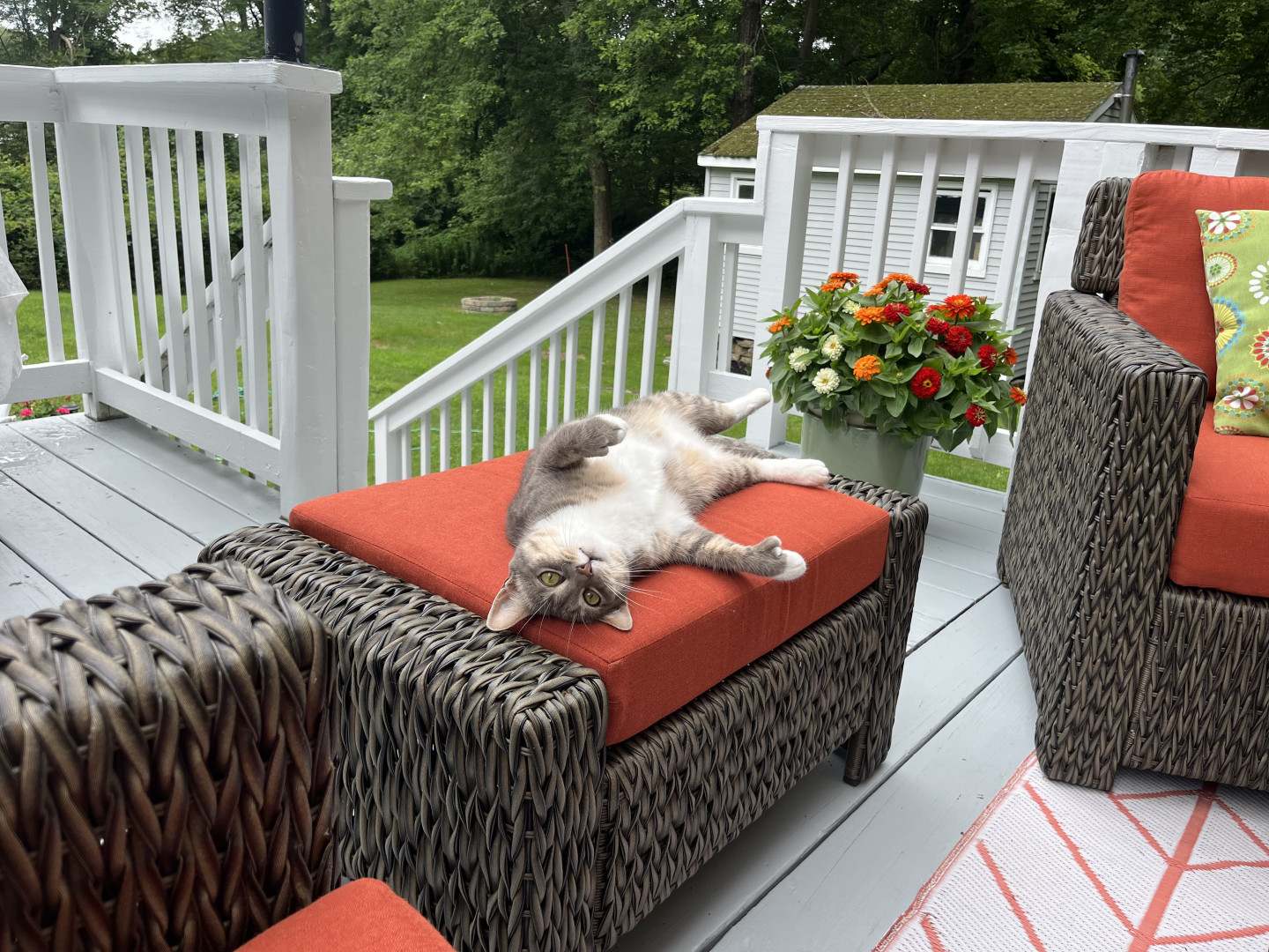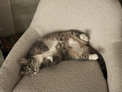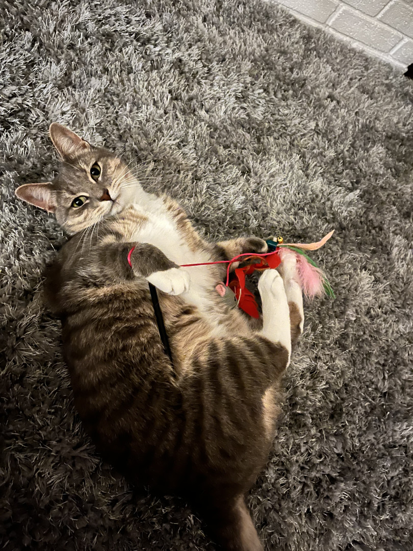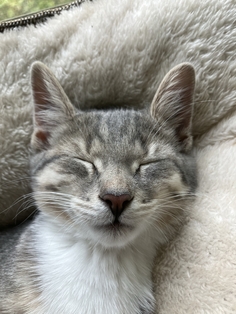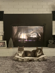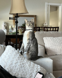 Derby was found in a rat trap as a kitten at a worksite. She quickly became an integral part of our family and learned to love and trust and has brought so much joy to our lives. She is a very unique girl, she is herself through and through. She loves to sit on a heated blanket, or on her bed by the fireplace. She has certainly had a change in lifestyle since the day she was found as a kitten. We love her very much and hope everyone else does too!
