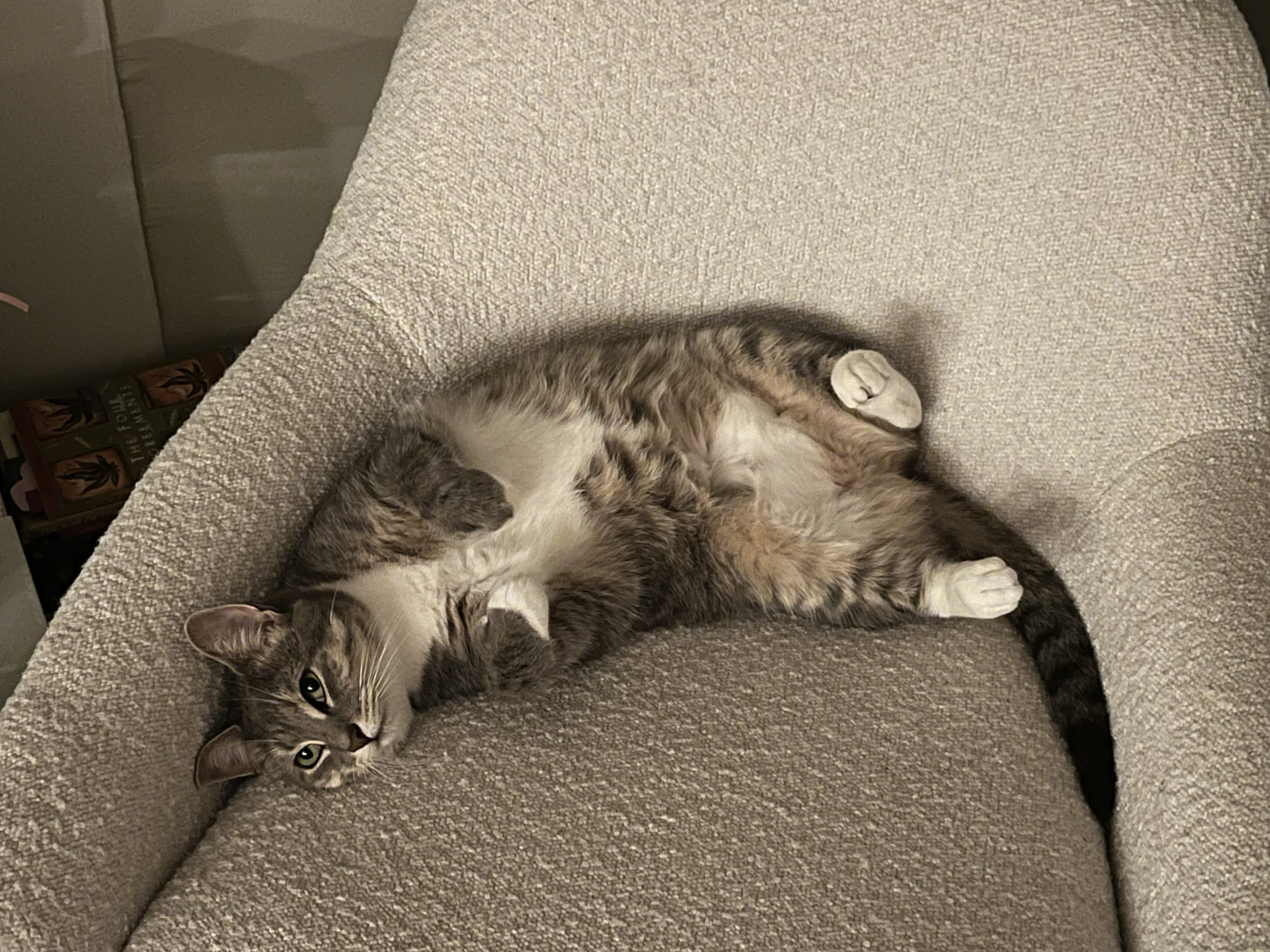 She has double paws, and sometimes stands like a meerkat to watch out the window :)