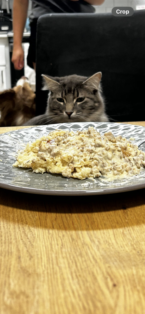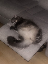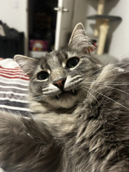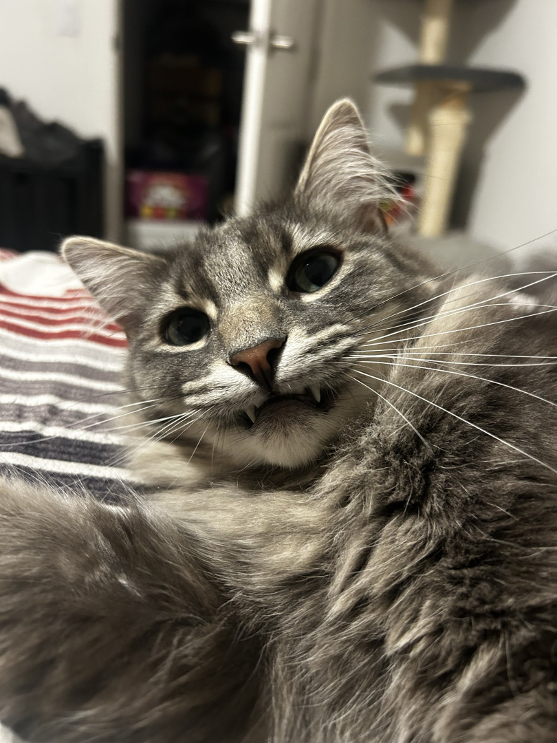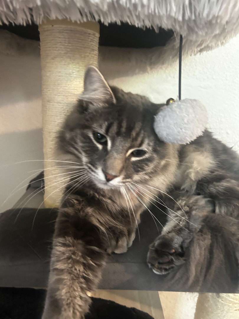 Dewy should be America’s Favorite cat because he could be the face of every cat meme ever made his quirkiness has done it all from the odd sleeping positions, the judgmental looks, belly rubs, and he even get hangry when he’s not fed at 5:00 and will slap dogs, cats, and humans heck sometimes he’ll nibble, and paw at my arm until I feed him. I think anyone would love him because his weird quirks, demanding, and I don’t care attitudes with his big fluffy face makes him the perfect fit.