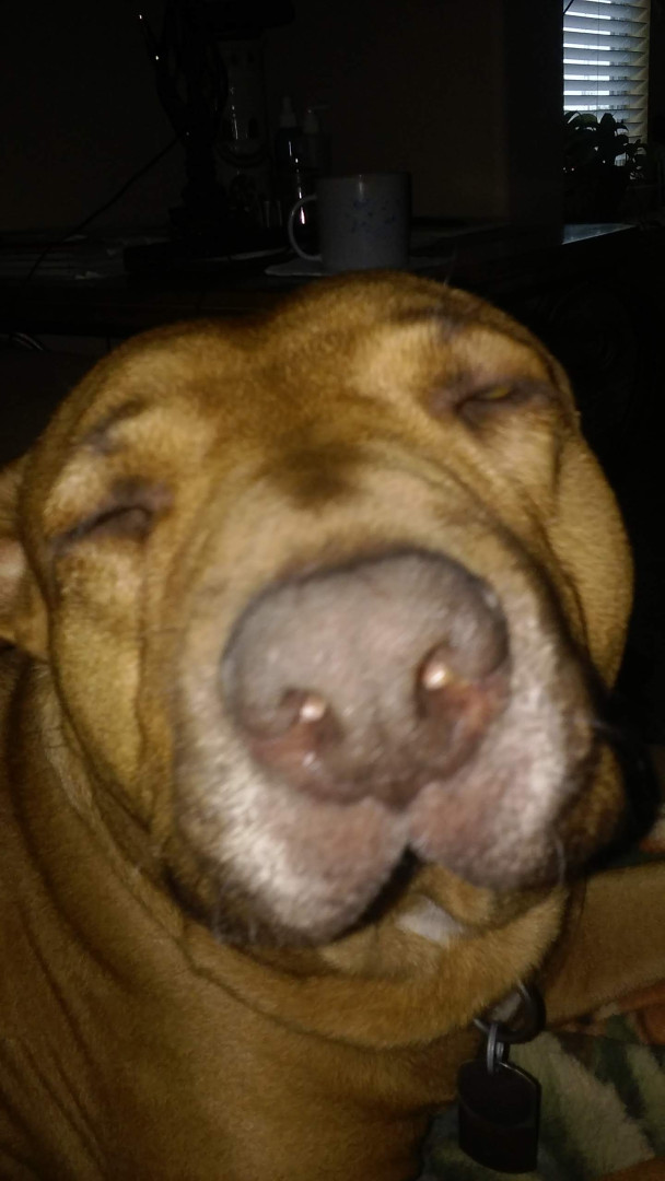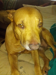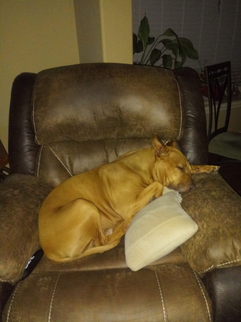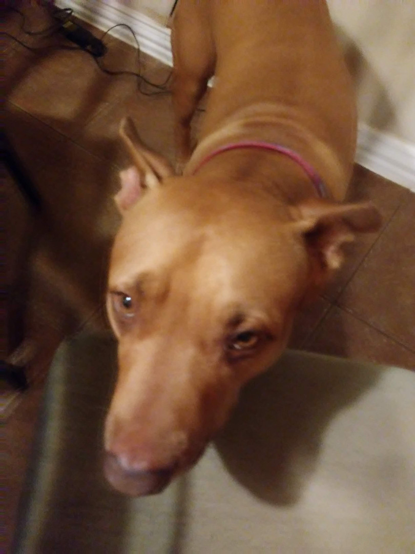 Digs found us 9yrs ago he is a Pitty Mix i believe. When first found he looked liked he was used as a bait dog.😞 He is a loving dog.