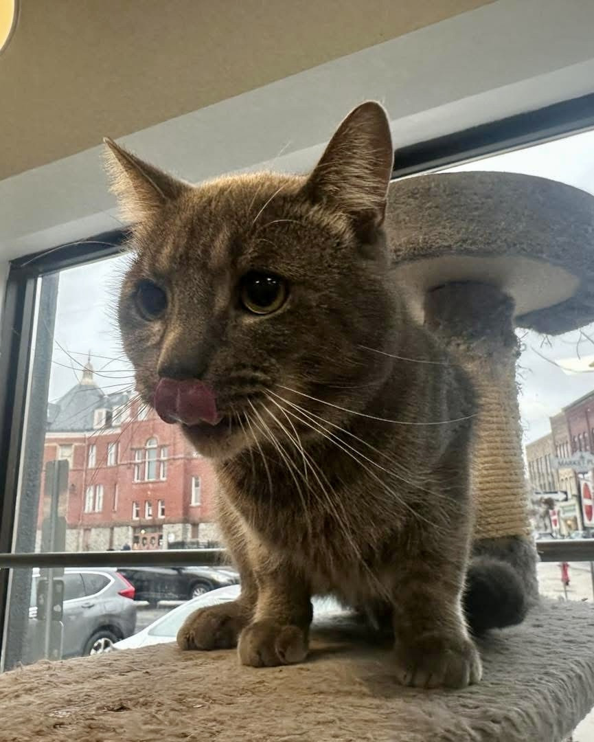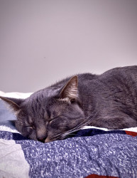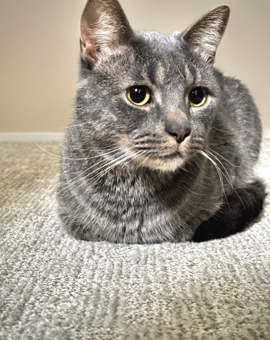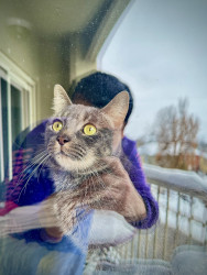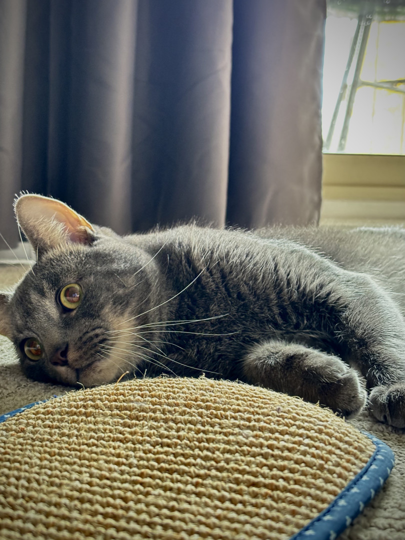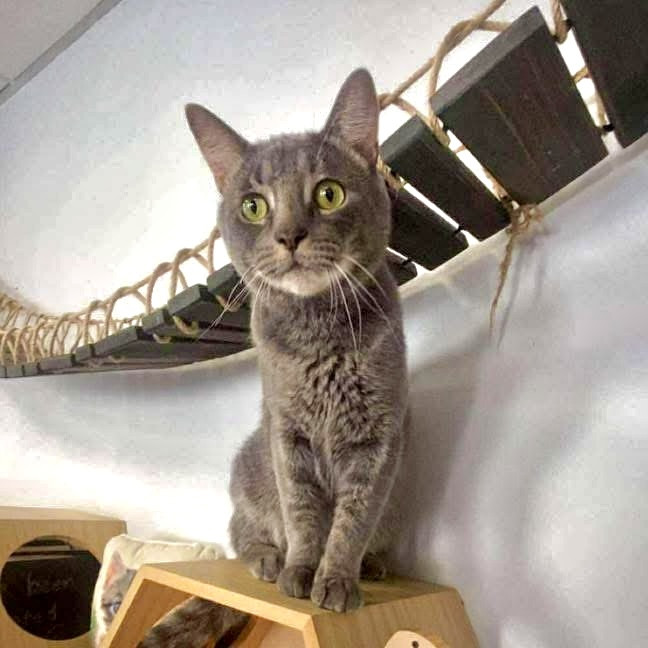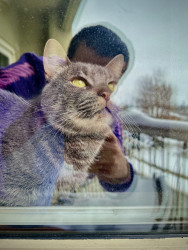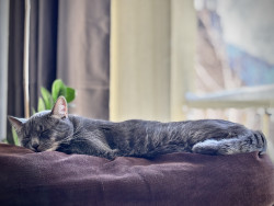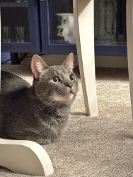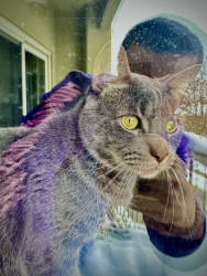 American short hair, playful, regal, adventurous, gray tabby 1 year old kitty, adopted and is the most affectionate cat ever…