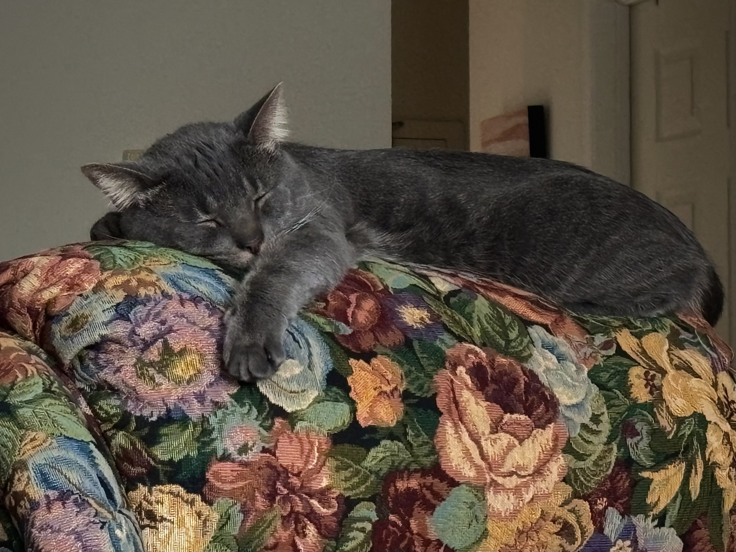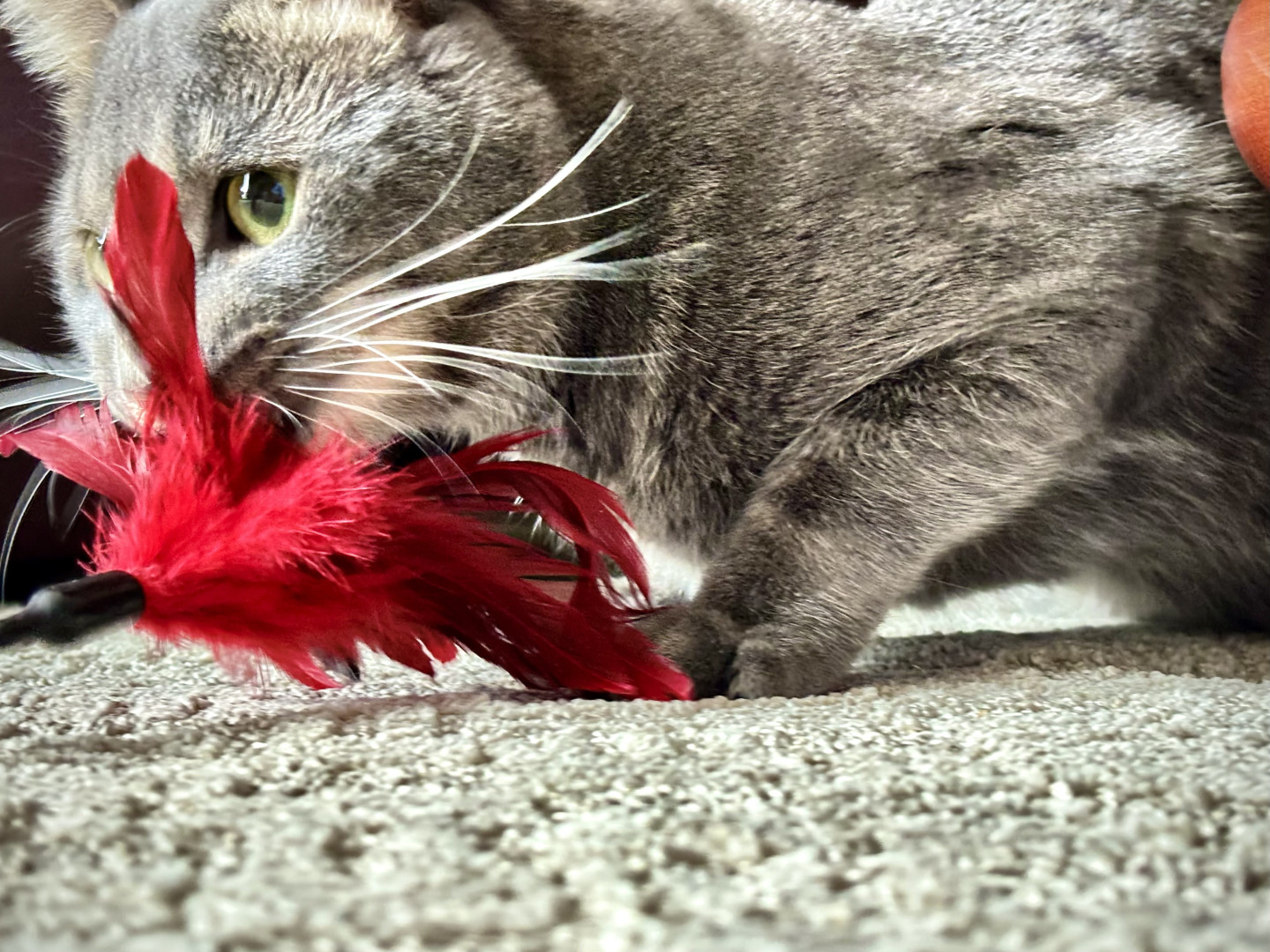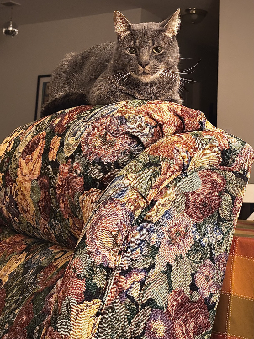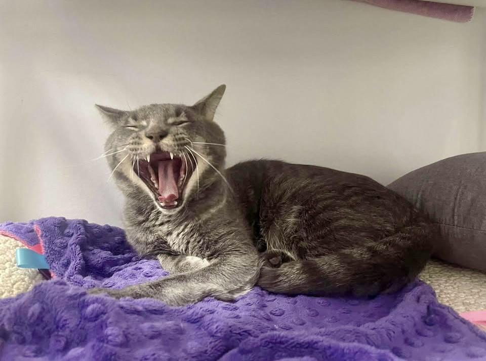 American short hair, playful, regal, adventurous, gray tabby 1 year old kitty, adopted and is the most affectionate cat ever…