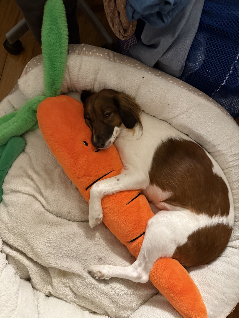 Learn Moredobbys favorite toys are any and all. i constantly see her walk around with a toy and see multiple in her bed for nightly cuddle. she loves carrots the most sometimes im scared she’ll turn orange over night.