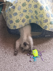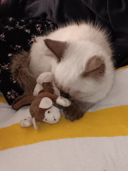 Learn MoreHis monkey toy was his favorite but he lost it 😔 Strings and things, but hair ties are his favorite!! Dobey loves trout flavored temptations, or any fishy treat!