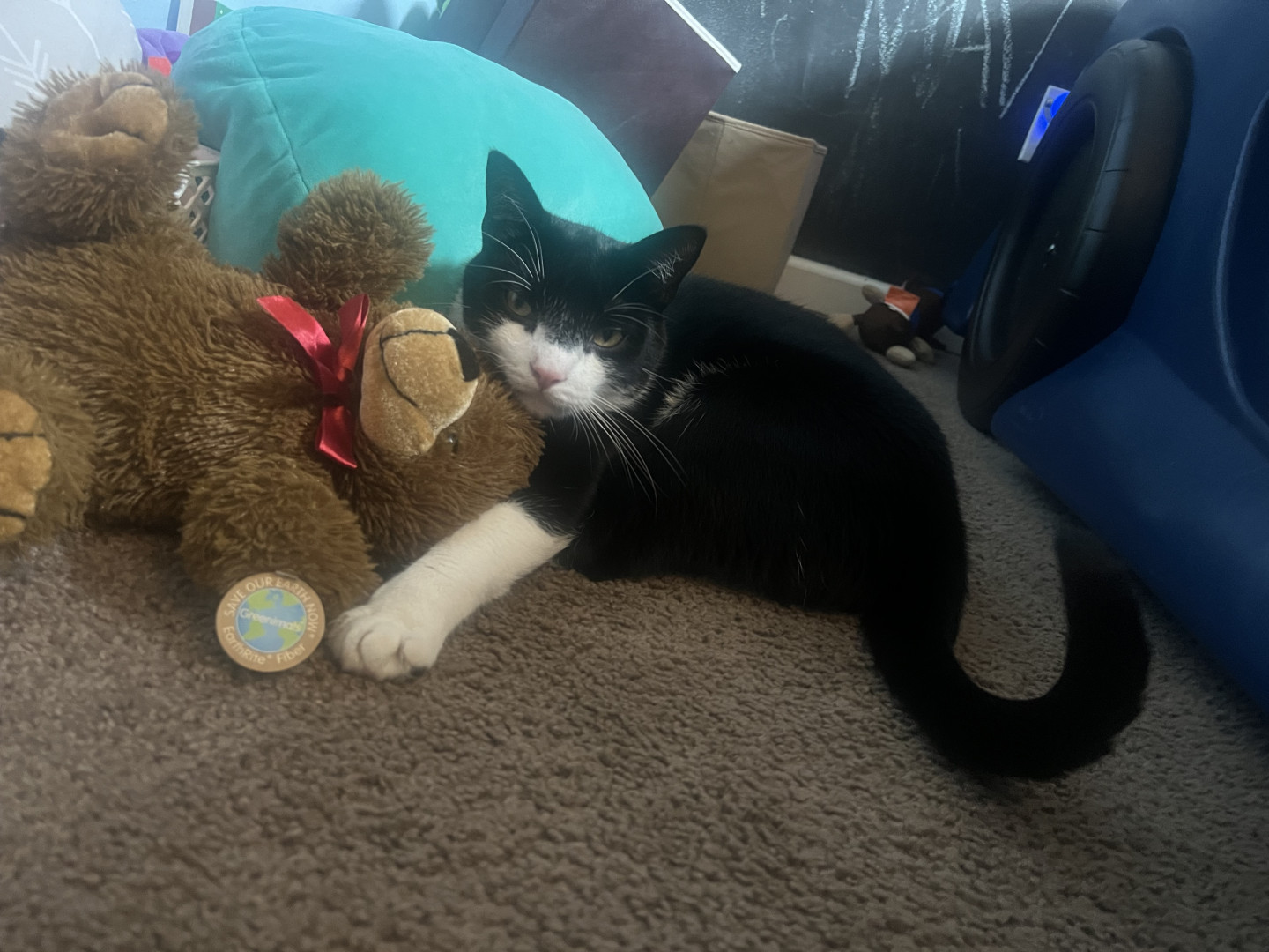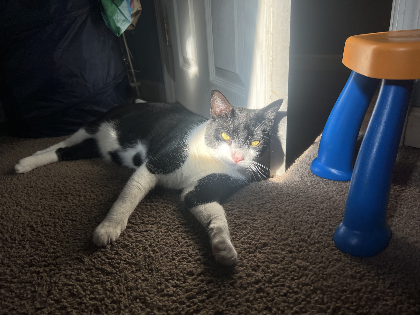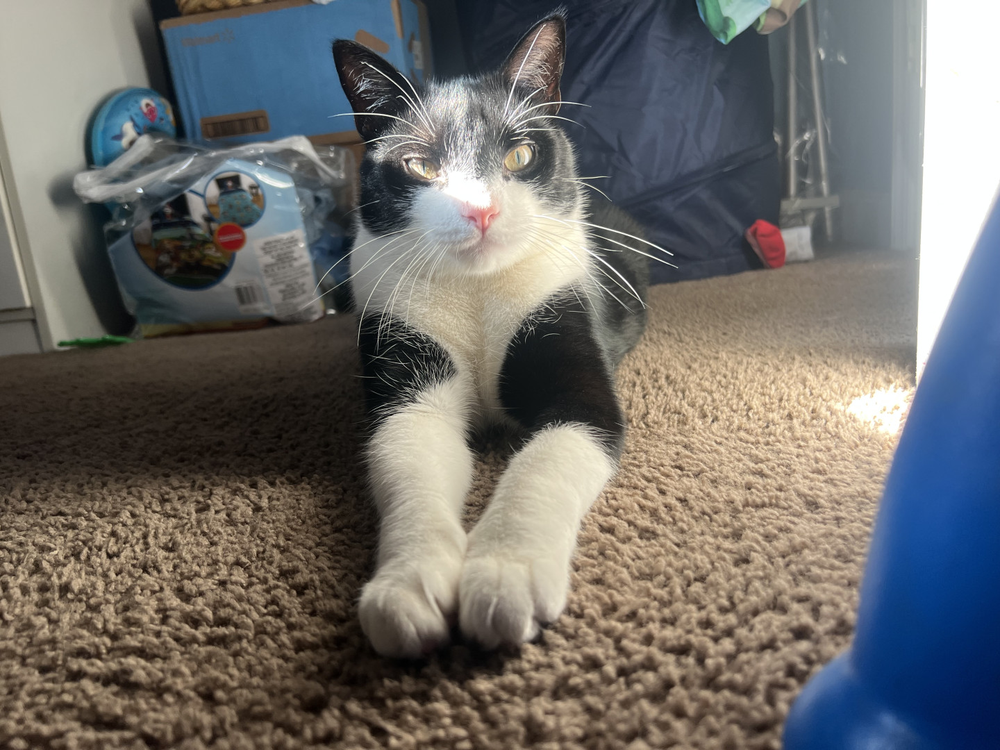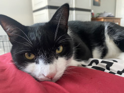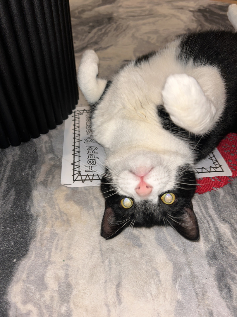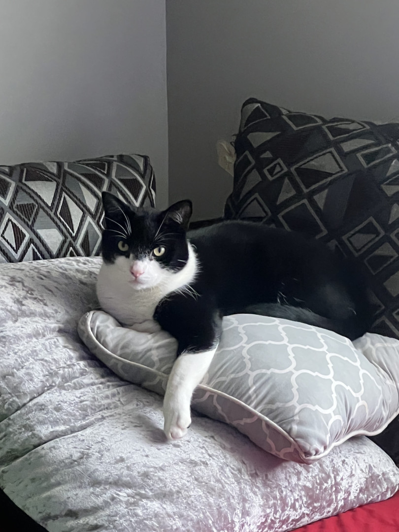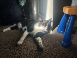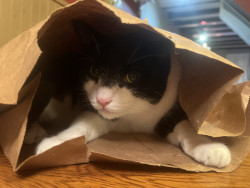 I found Doc under a loading dock while managing a warehouse when I was 22 years old. Hence the name “Doc”. He was too small and had to be bottle Fed. I kept him in a box in my boss’s office till I clocked out for 10 hours. He stood facing the corner of the box the whole time. To this day he claims any box that comes into the house as his fort. You cannot touch his box until he’s done with it. No interest in cat beds. Gentle with babies, eats dog food lol. We both had no family, we got one now!
