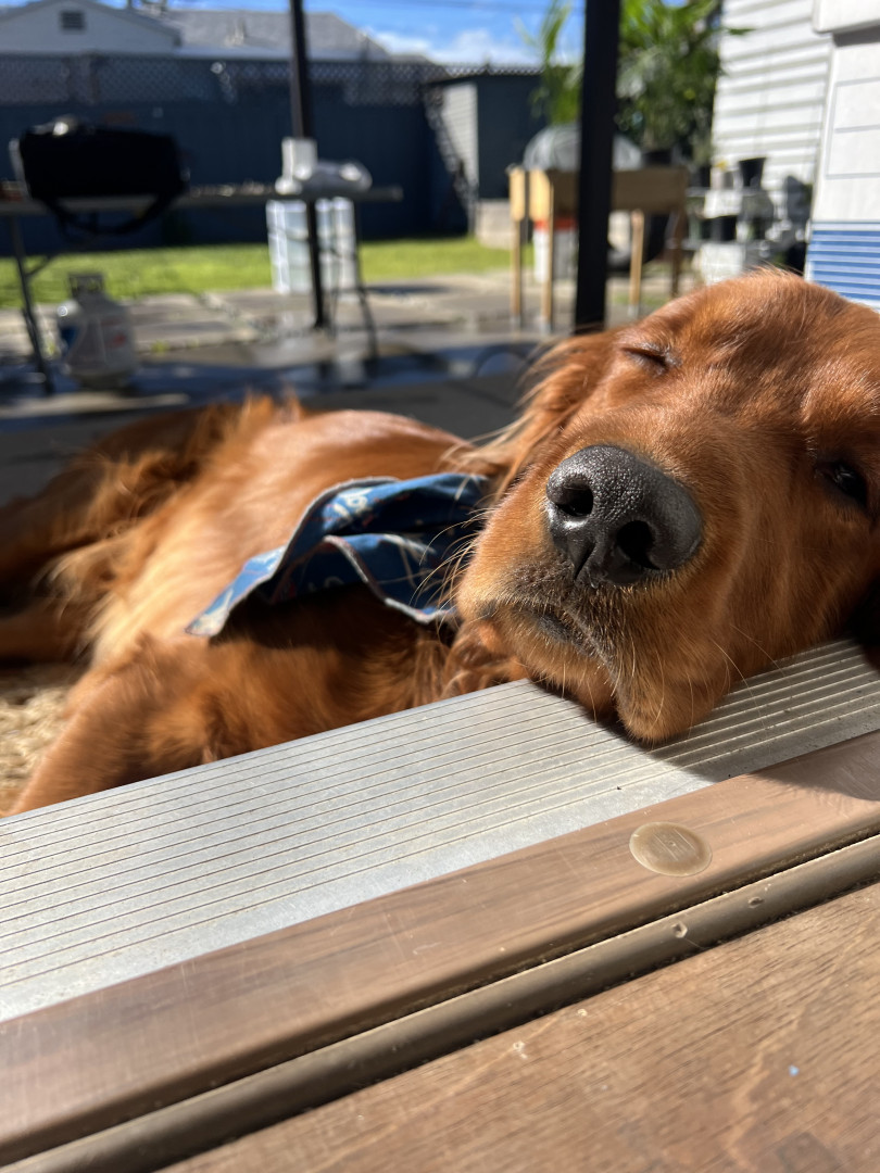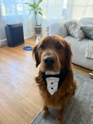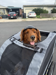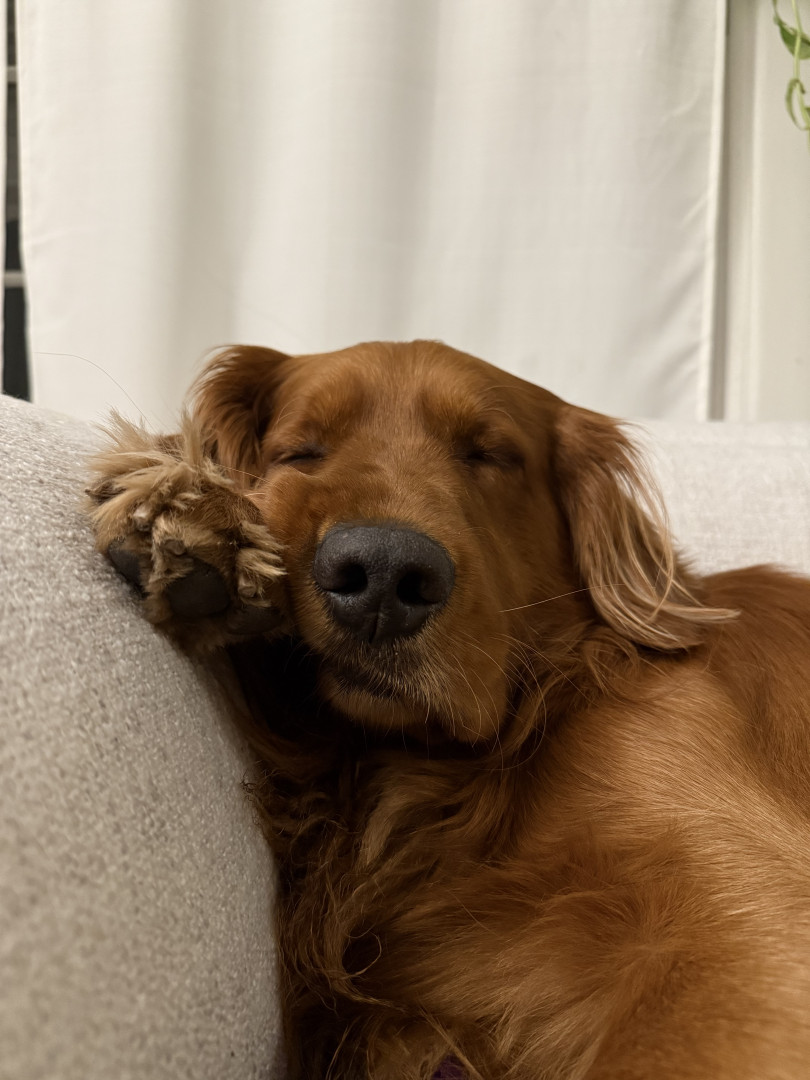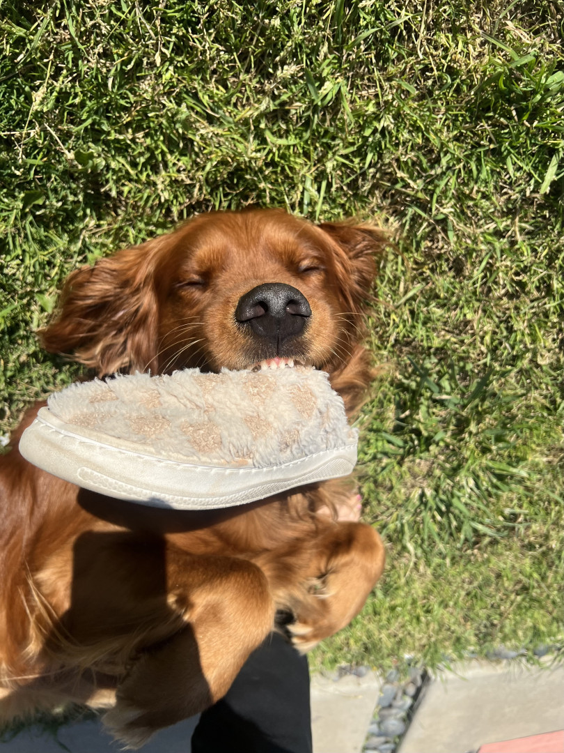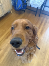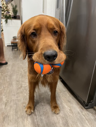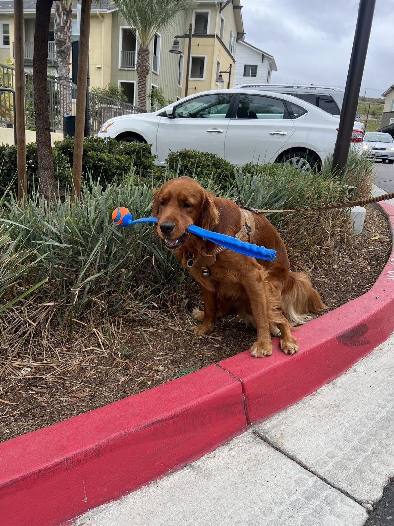 A ball obsessed field golden retriever, who loves to steal your socks, tv remote & shoes. Always demands to carry a baby on every walk