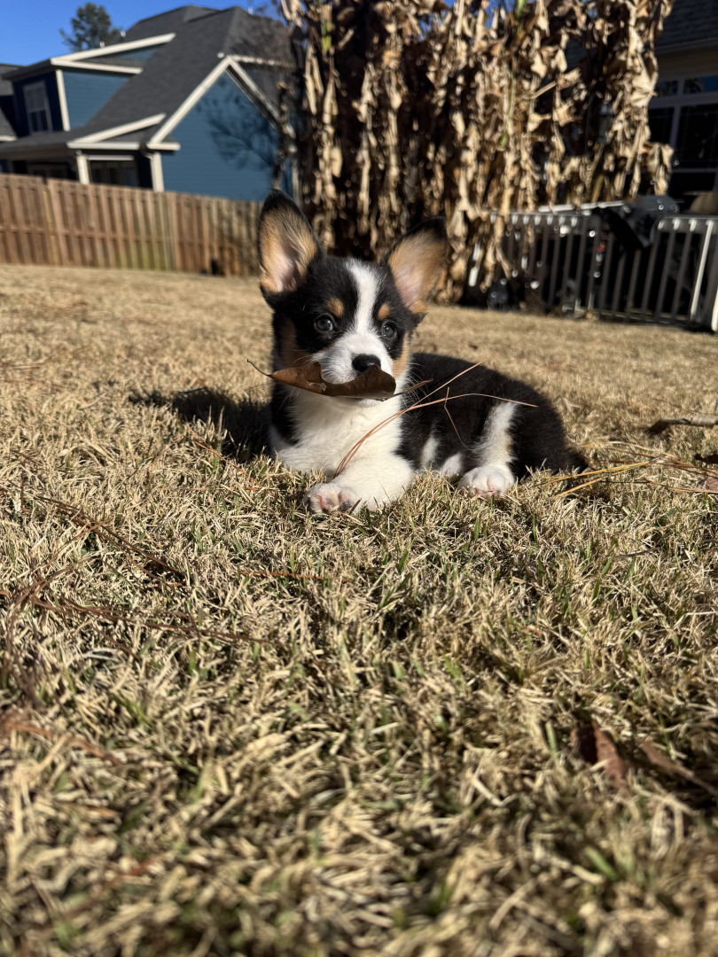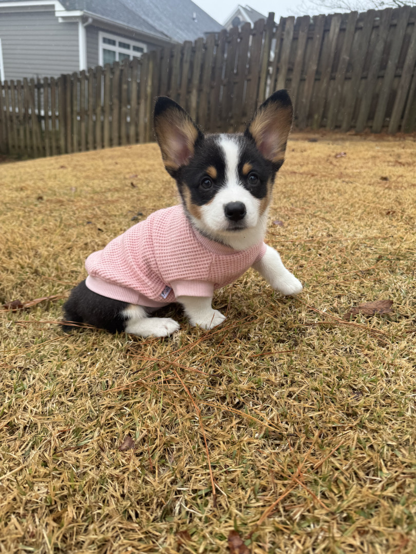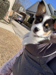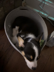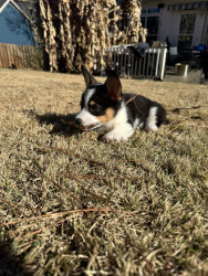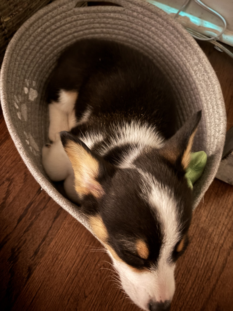 dolly is an 8 week old corgi puppy! she is very sweet and playful, loves sleeping in baskets, riding in her carrier, and wearing sweaters!