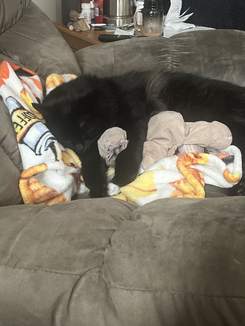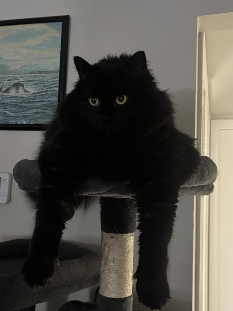 Doodle should be Americas favorite because he is a sweet boy with an old soul. You will always find him curled up next to his humans or on his cat tree watching over everyone, as he runs the show. He is a big fluffy boy with nothing but love to give.