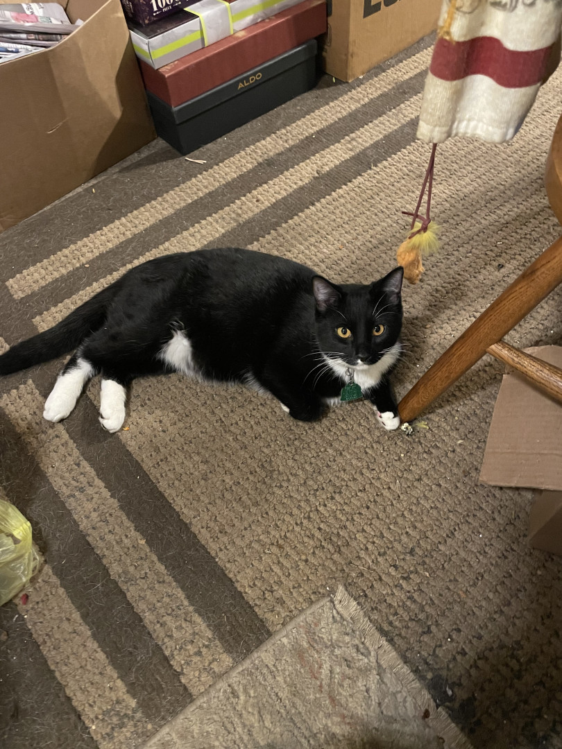 He’s a tuxedo cat! He has beautiful green eyes and white whiskers. His black fur is long and silky!