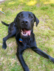 Doug is half Labrador and half Golden Retriever so he maintains a sleek short coat but with the fluffiness of a golden. He’s solid black except a small white bolo on his chest